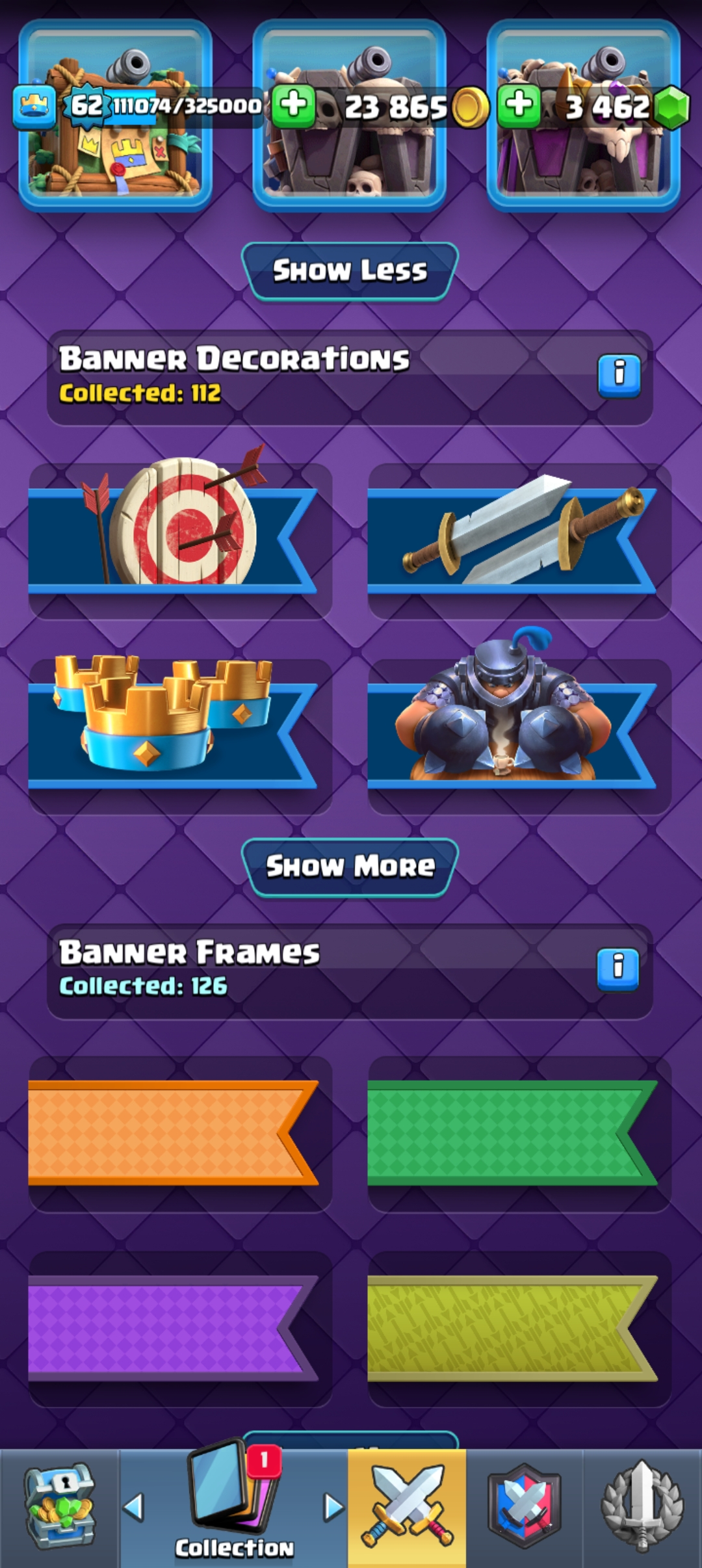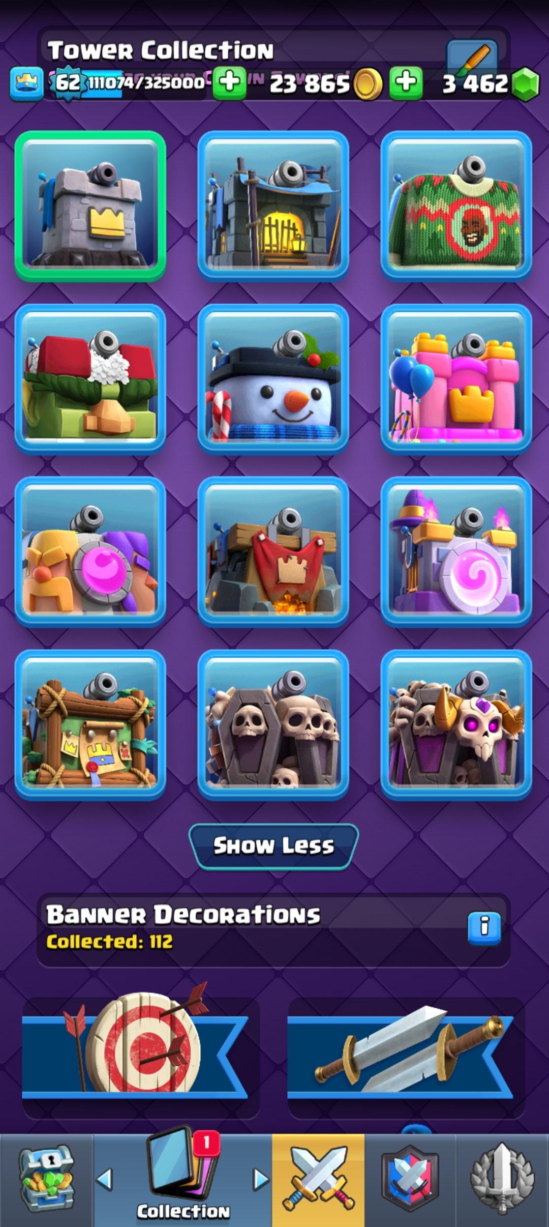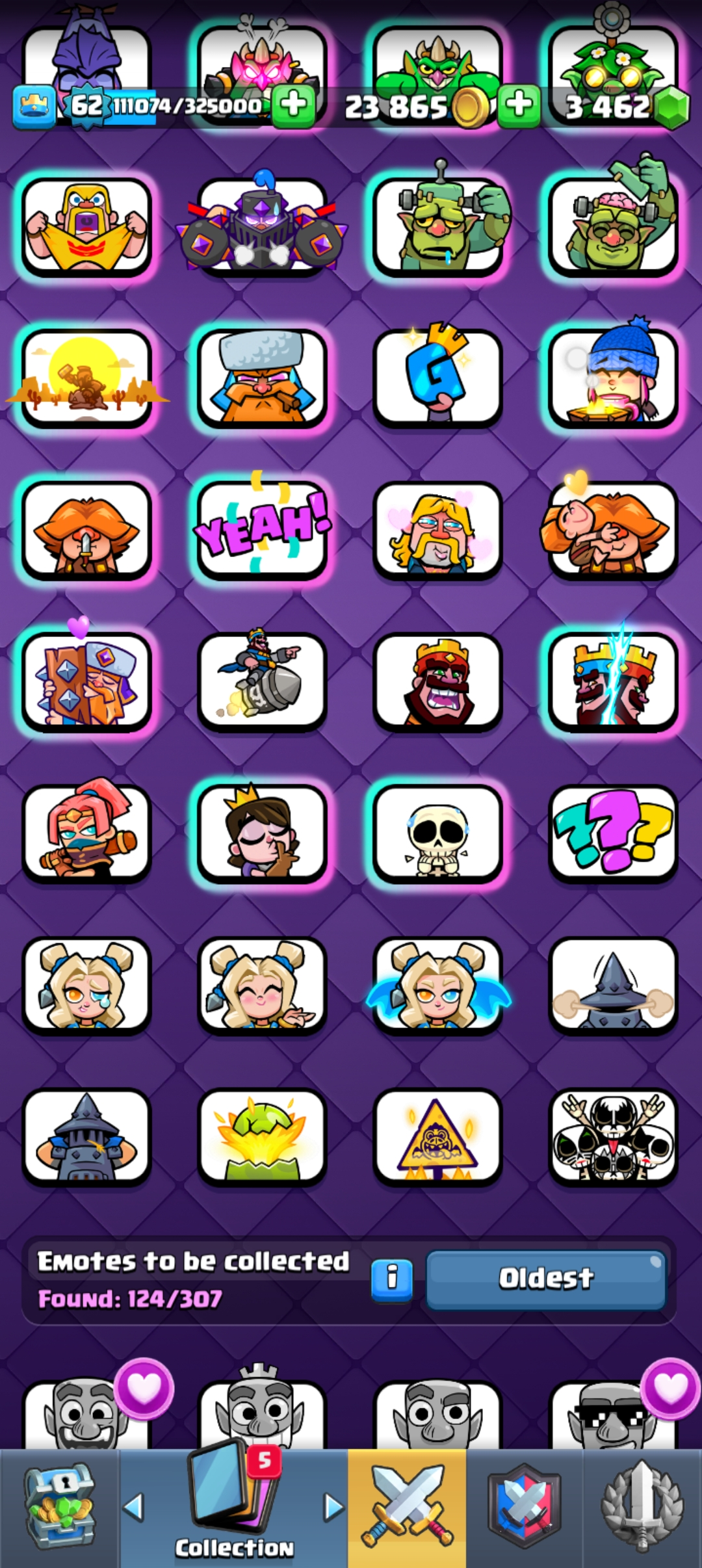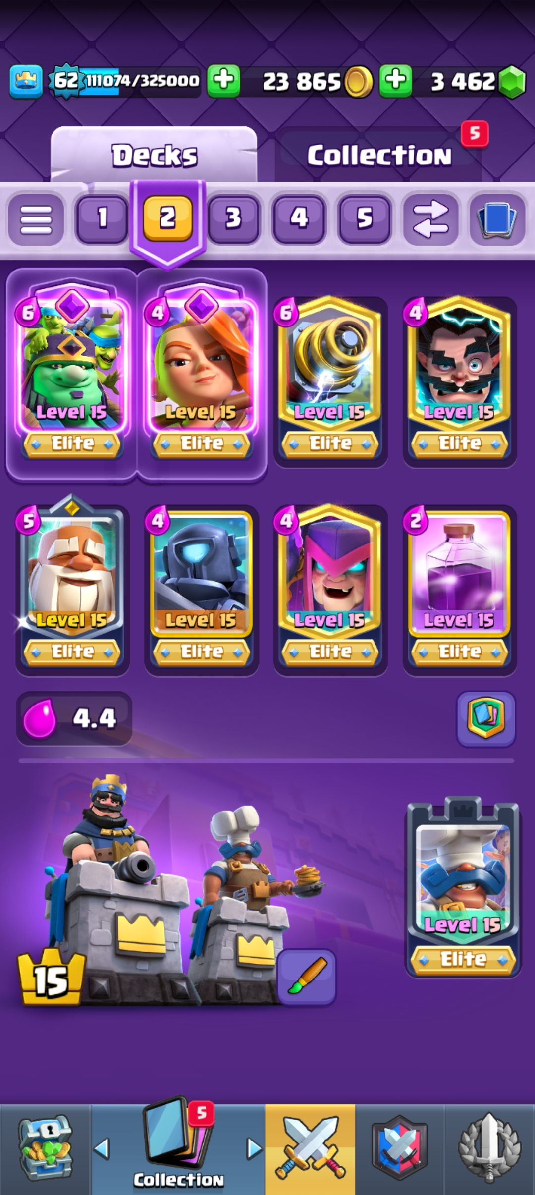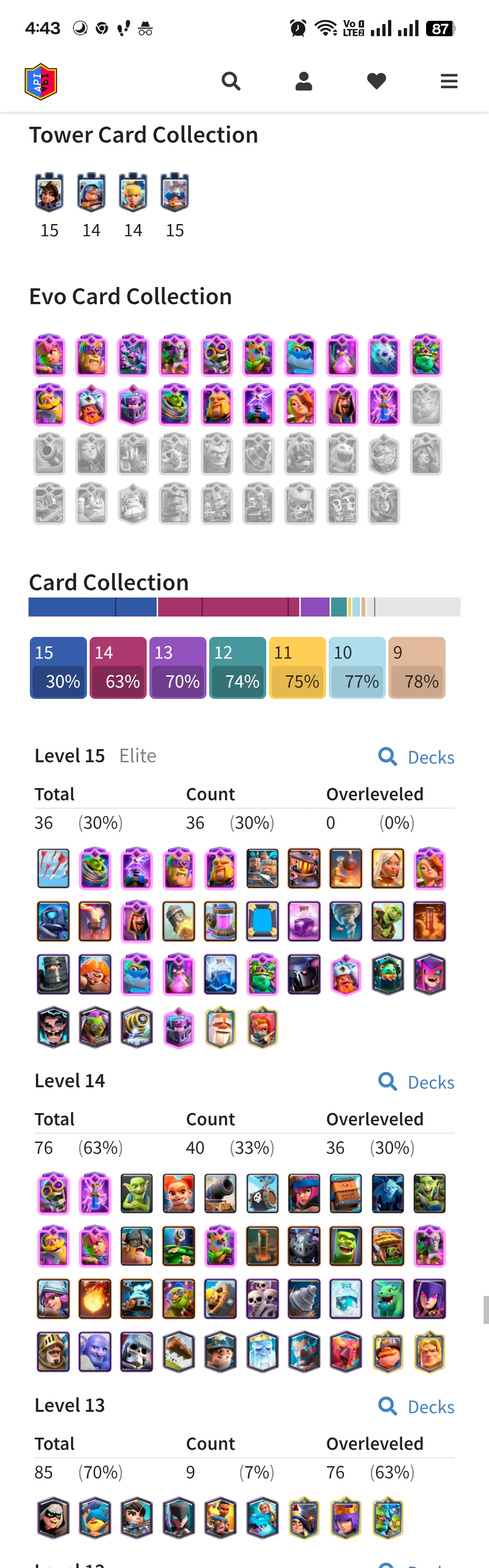 CR Lvl 62 ✨ 15000 Trophy ✨ KT 15 ✨ 36 Elite Cards ✨ 76 max cards ✨ 19 Evo Cards ✨ 124 Emotes ✨ 11 Tower skins