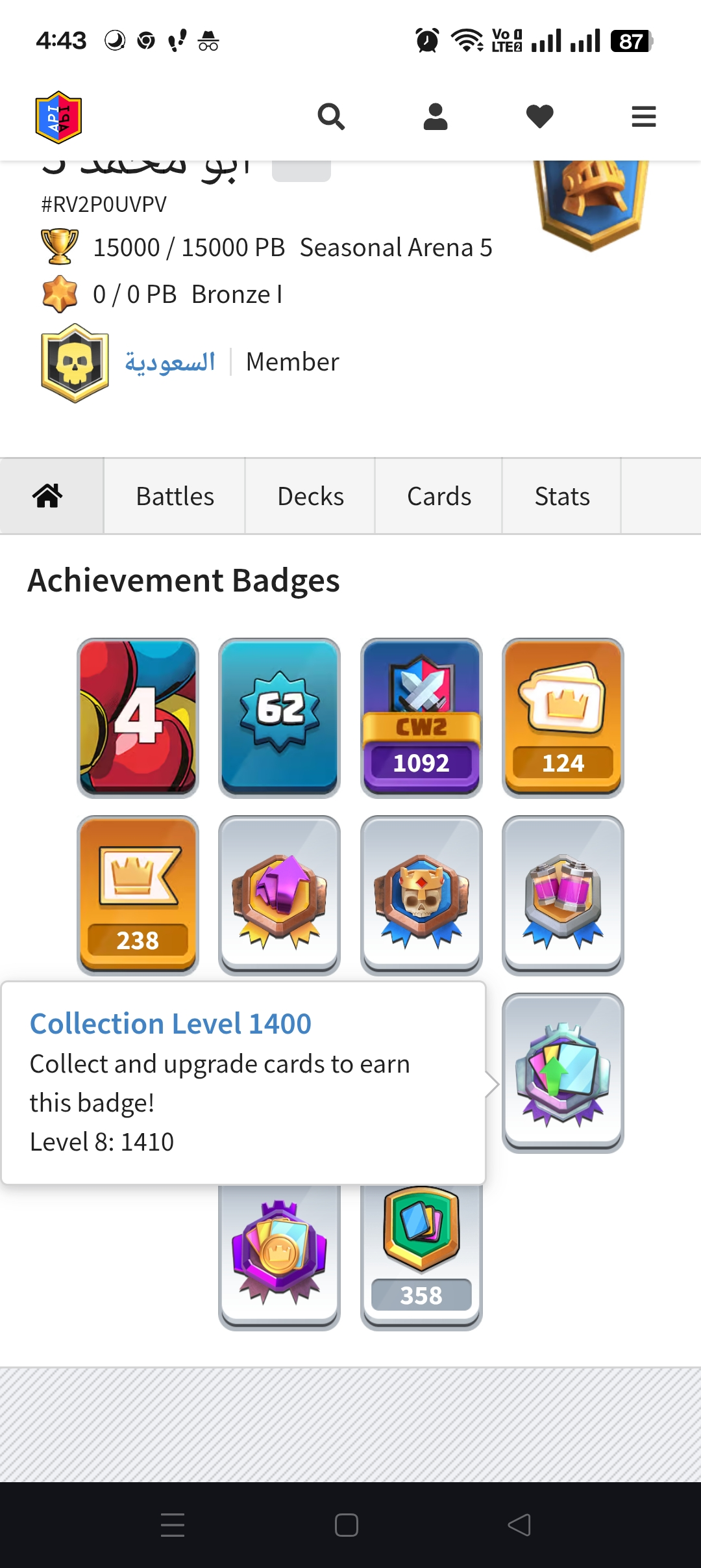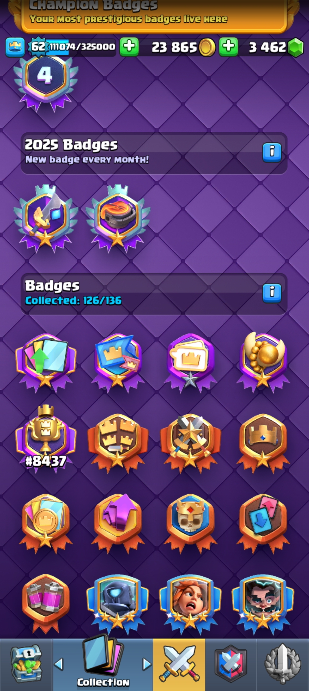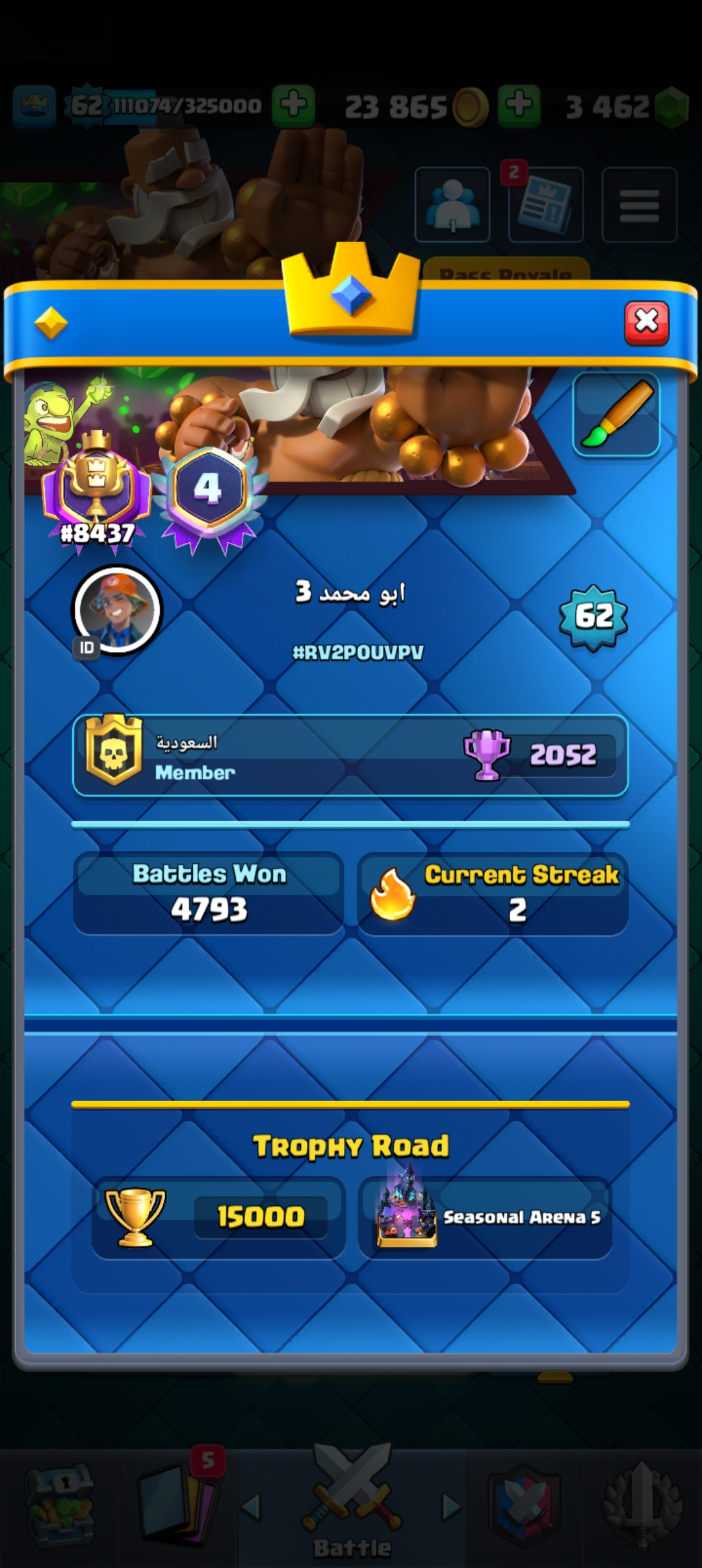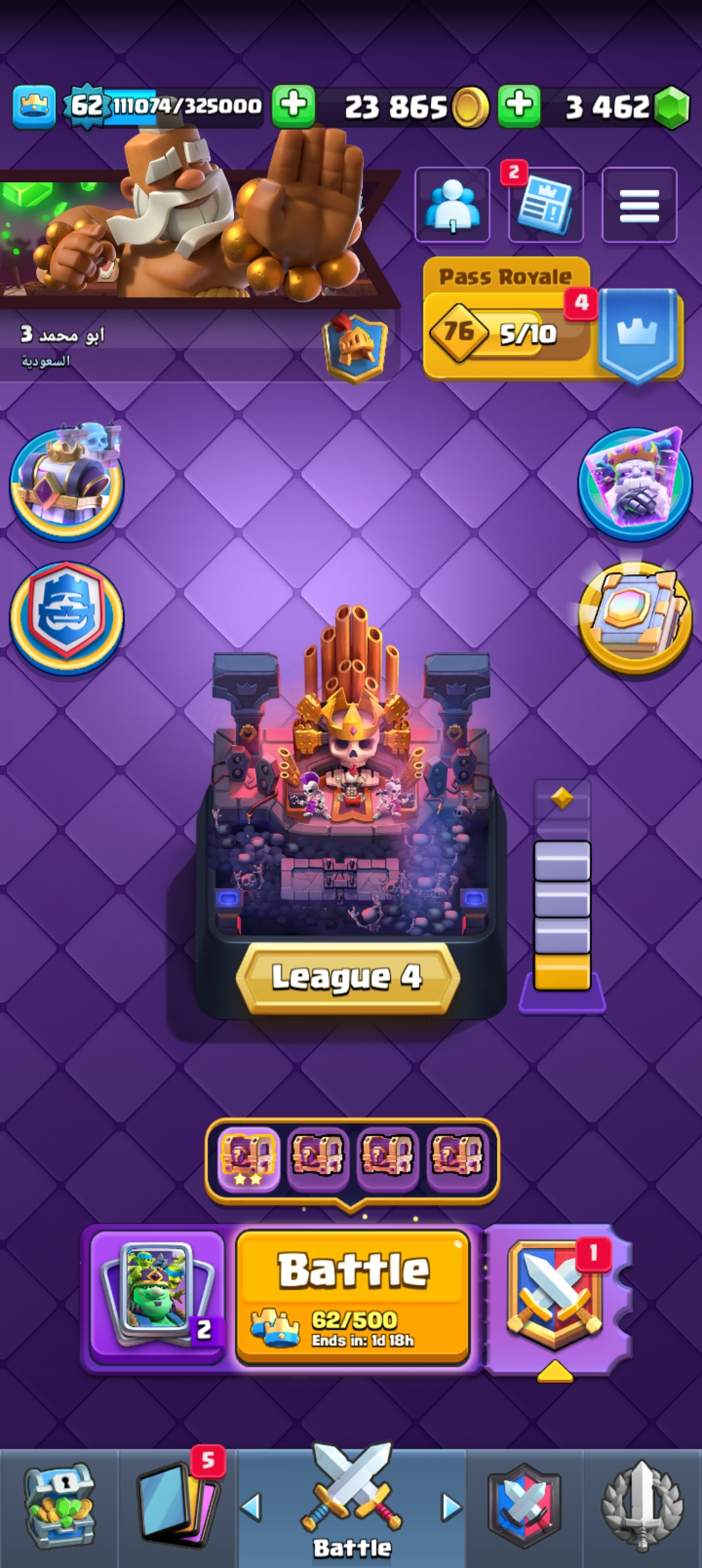 CR Lvl 62 ✨ 15000 Trophy ✨ KT 15 ✨ 36 Elite Cards ✨ 76 max cards ✨ 19 Evo Cards ✨ 124 Emotes ✨ 11 Tower skins