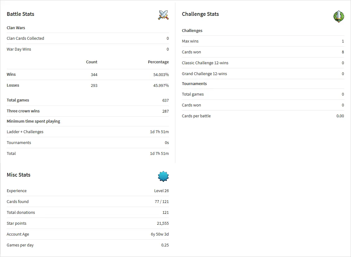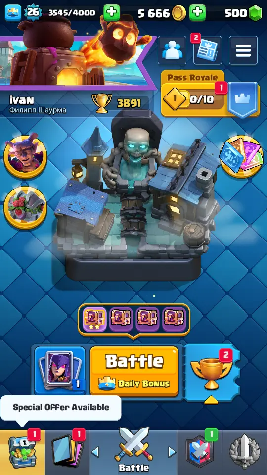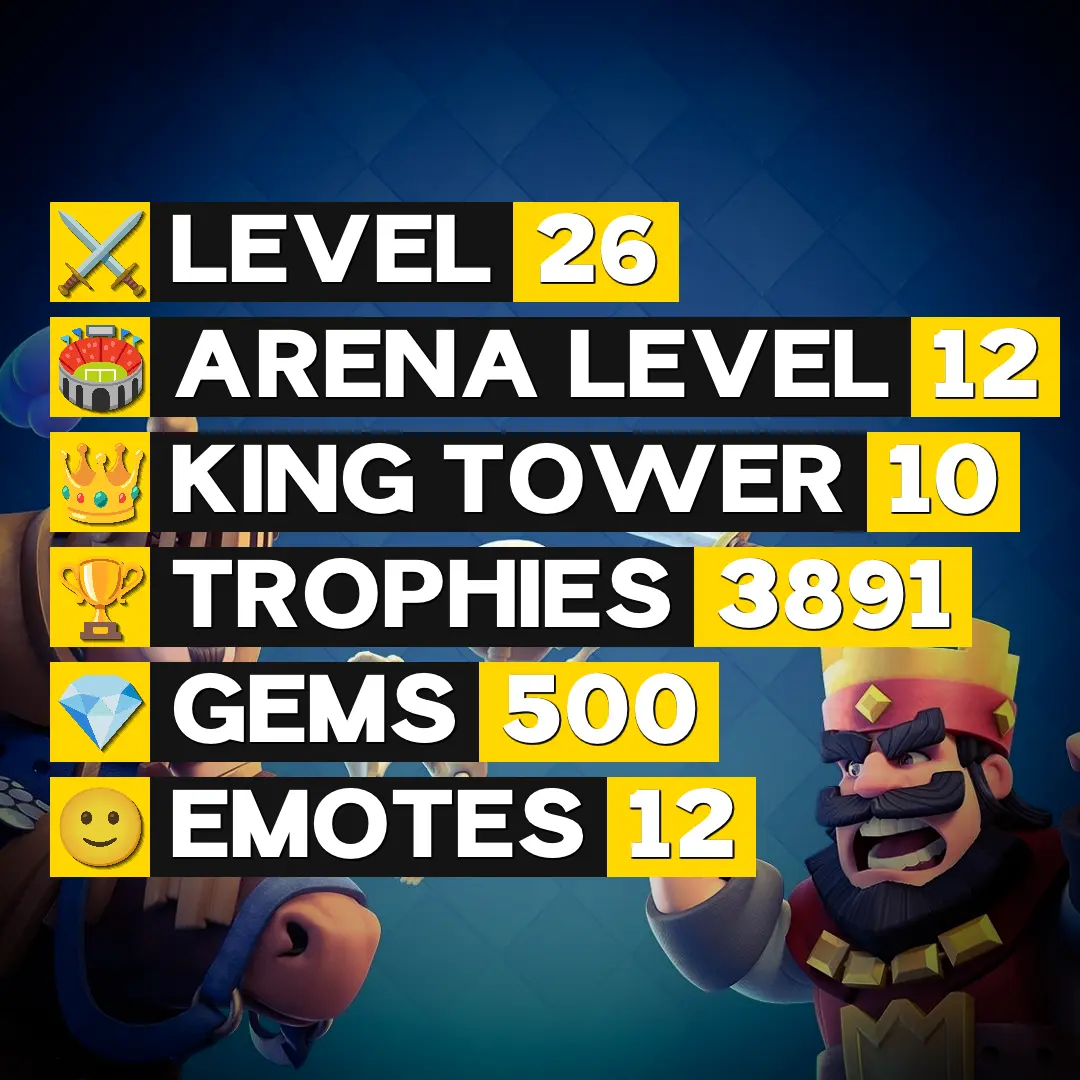 👑 King Tower 10 🏆 3891 Trophies ⚔️ Level 26 💎 Gems: 500 🧬 Evolutions: 0 🔒 Recovery Codes