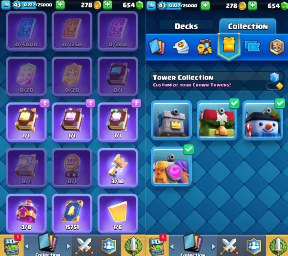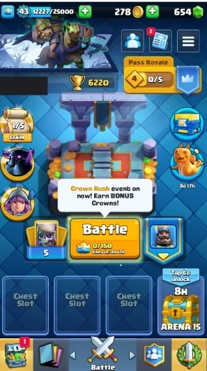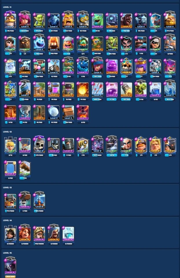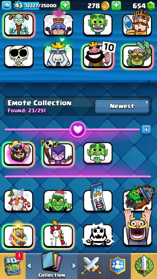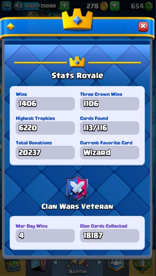 👑KT 14 👑 6220 Trophy 👑 43 LVL 👑 113 Cards 👑 23 Emotes 👑 654 Gems 👑 1 k Gold 👑