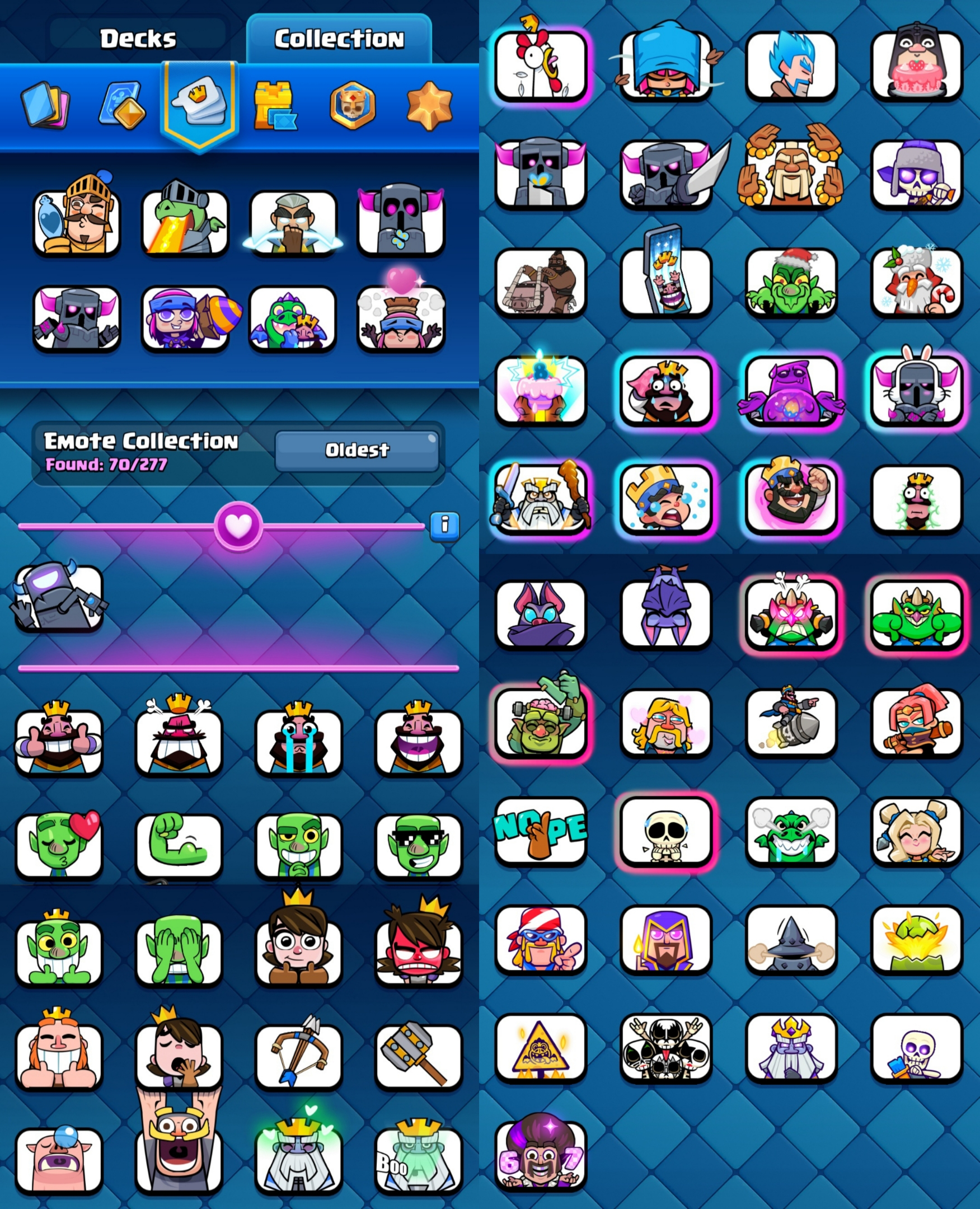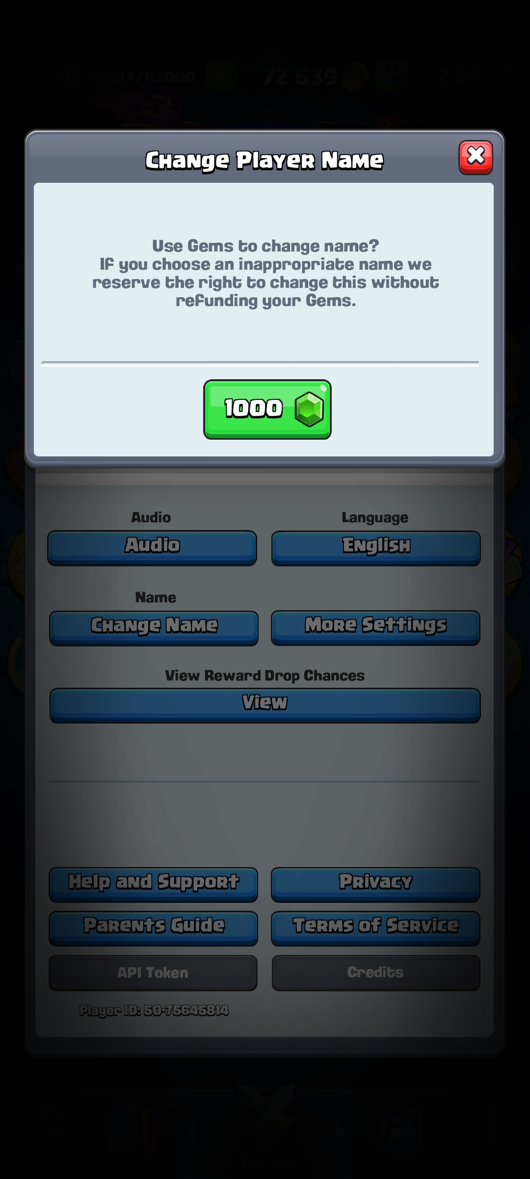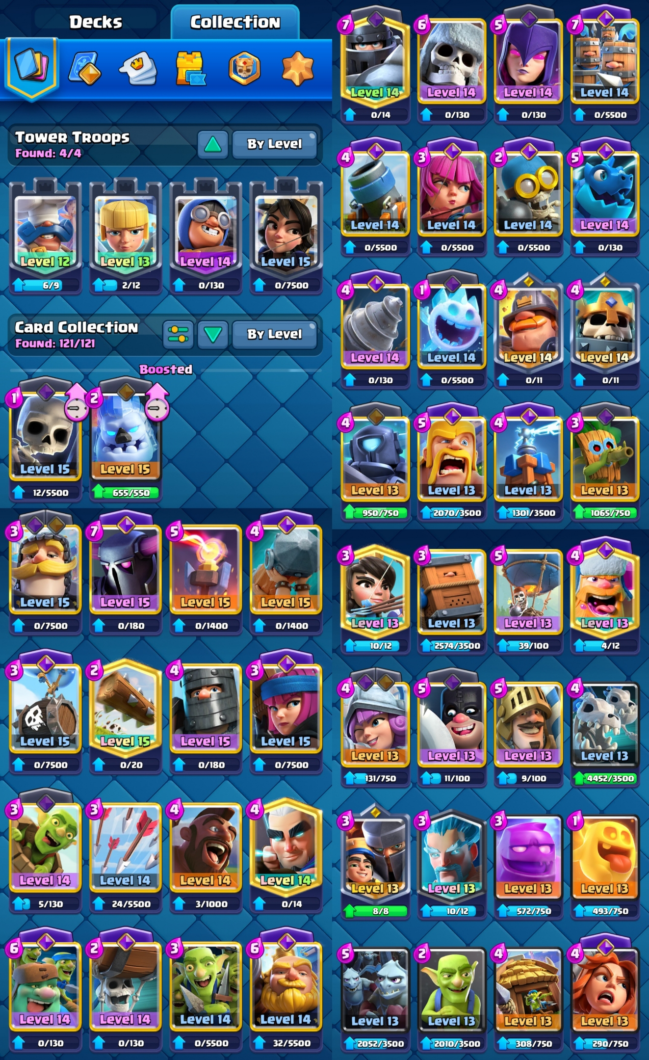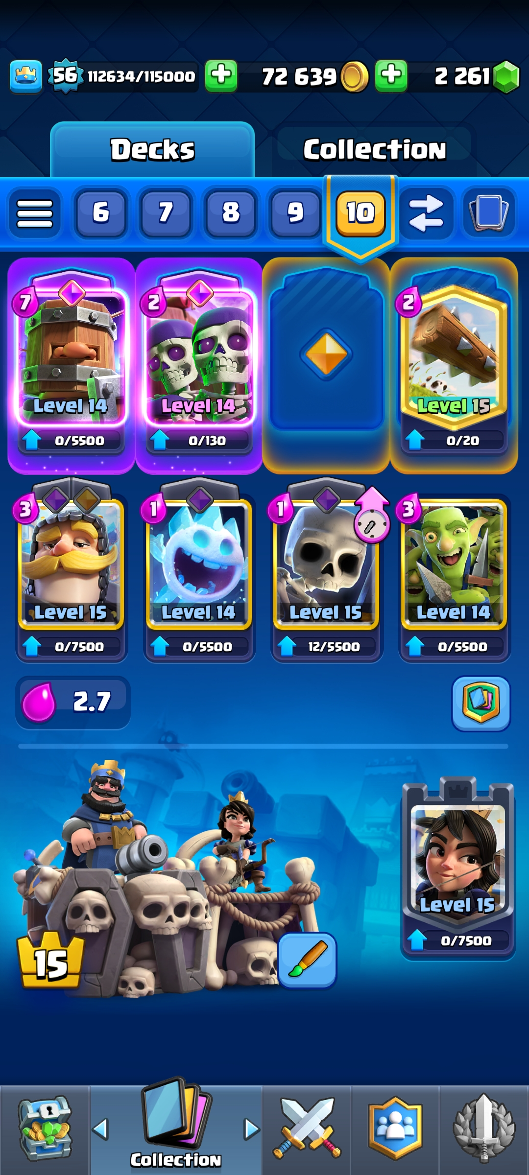 ⭐ KT 15 ⭐ KT Level 15 ⭐ Exp 56 ⭐ 8 Level 15 & 21 Level 14 Cards ⭐ 18 Evolution ⭐ 8 Towerskins ⭐ 70 Emotes ⭐ 10k Trophies ⭐ Namechange 1000