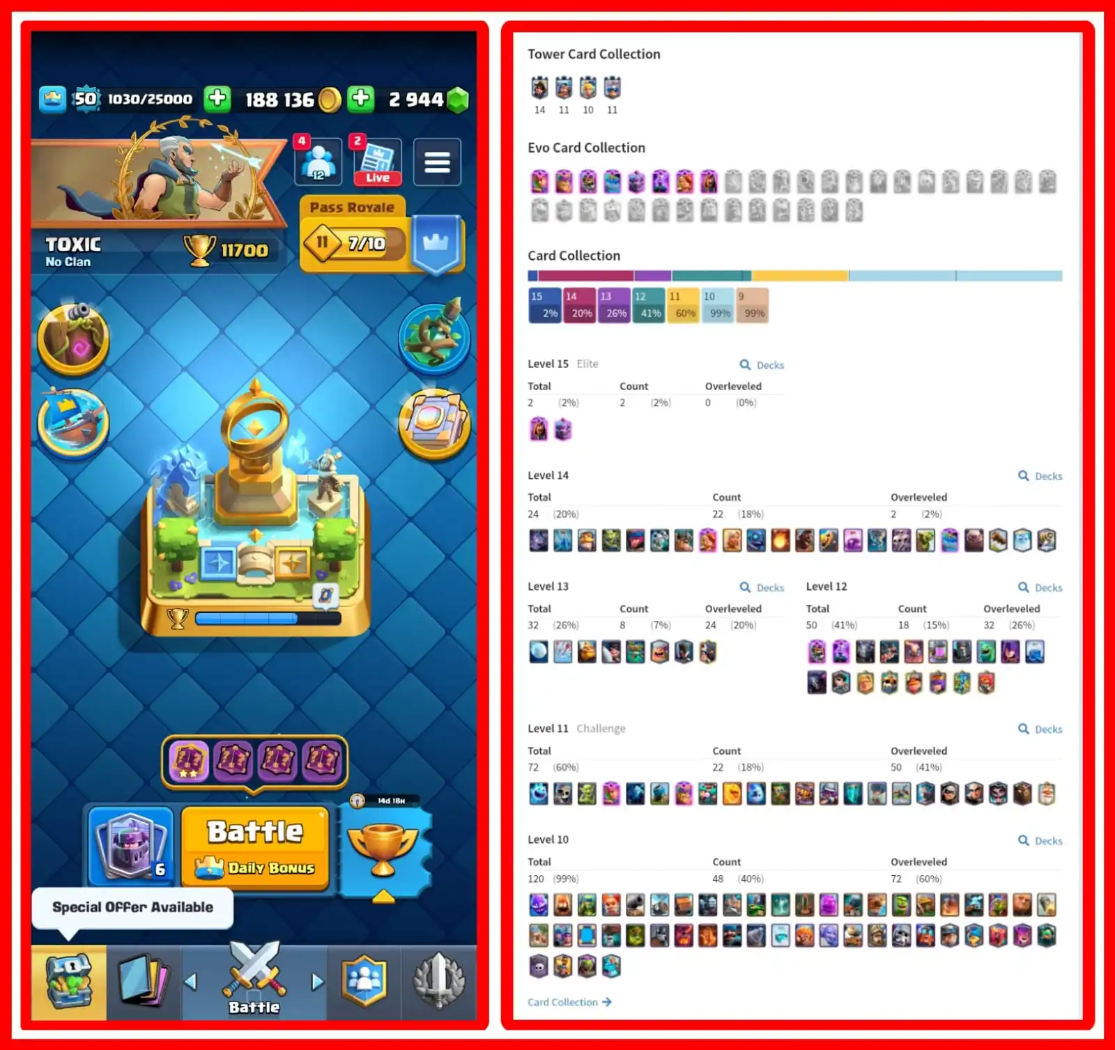 LEVEL 50 🚀😍 11700 TROPHIES 🏆 SEASONAL ARENA LEVEL 2 ❤ KT LEVEL 14 ☠ 8 EVOLUTION CARDS 🤩 2 ELITE CARDS 😍 24 MAX CARDS ☠🎁 NAME CHANGE 500 GEMS 💎☠ CHEAP PRICE 💸 INSTANT DELIVERY ☑💯 ANDROID & IOS ☑🤝