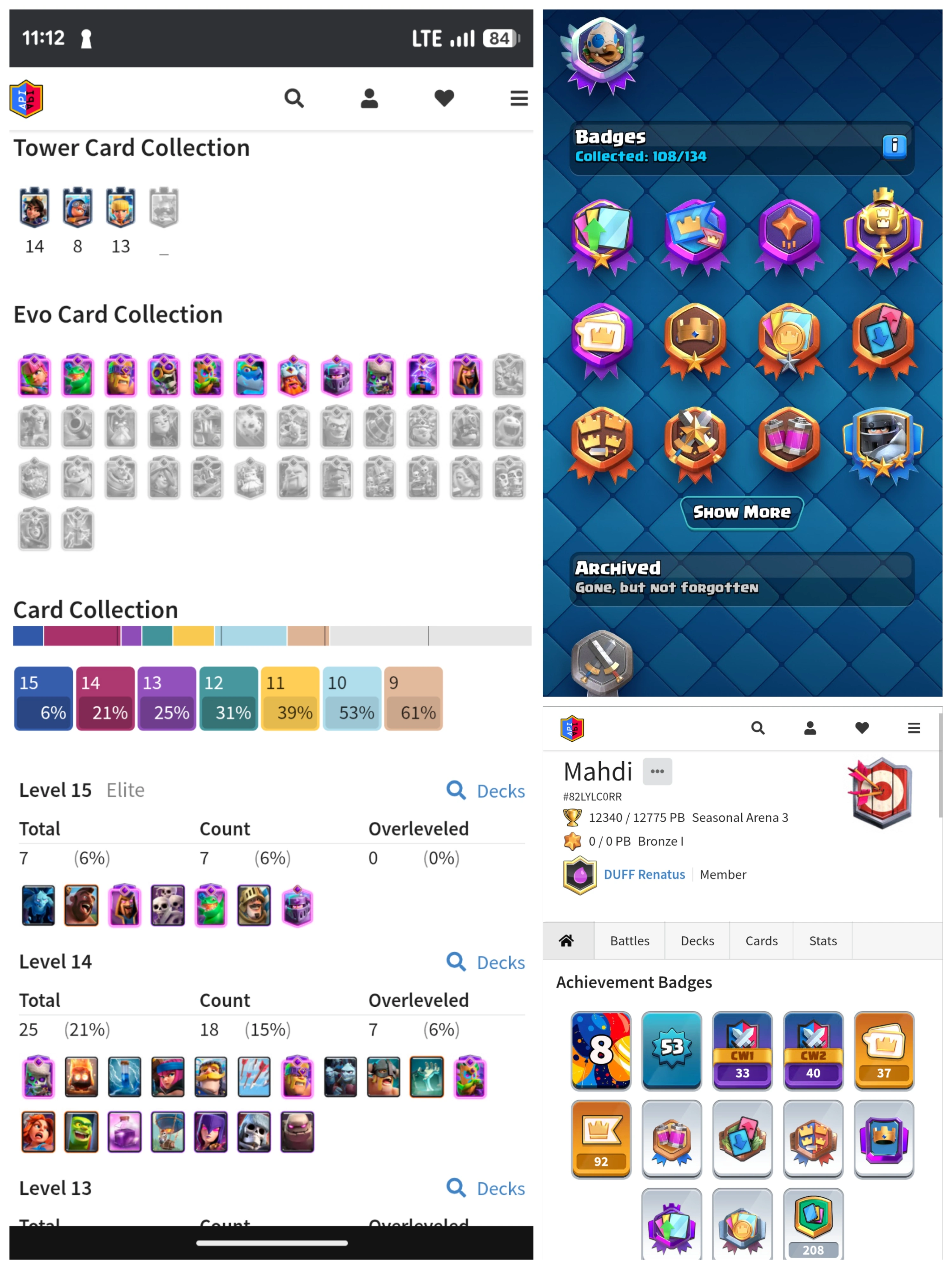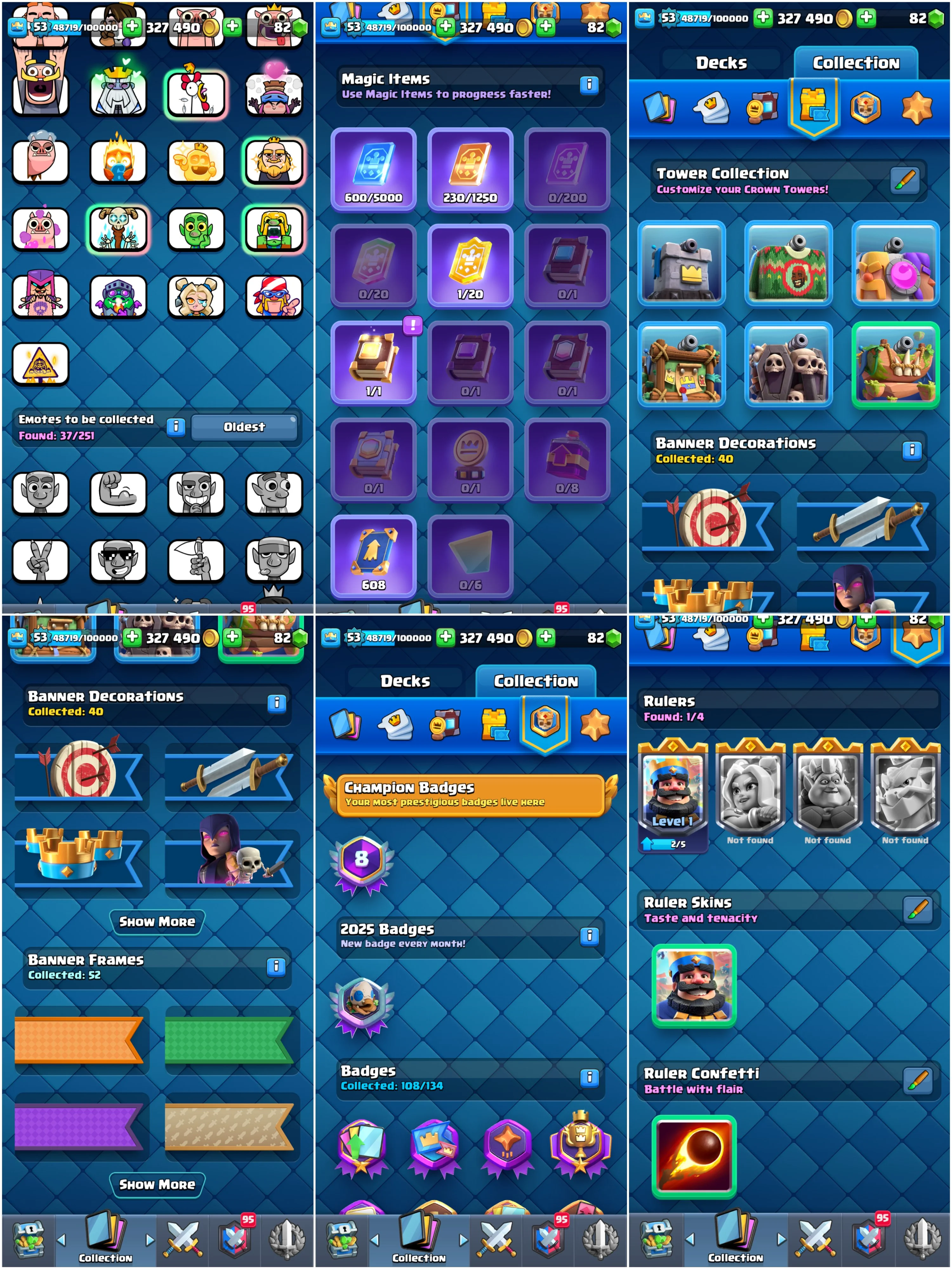🏆 Rarest 8 Years Played Badge • Level 53 + KT 14 🎯 12,340 Trophies • 25 Max Cards • 7 Elites • 11 Evolutions ✨ 37 Emotes • 6 Tower Skins