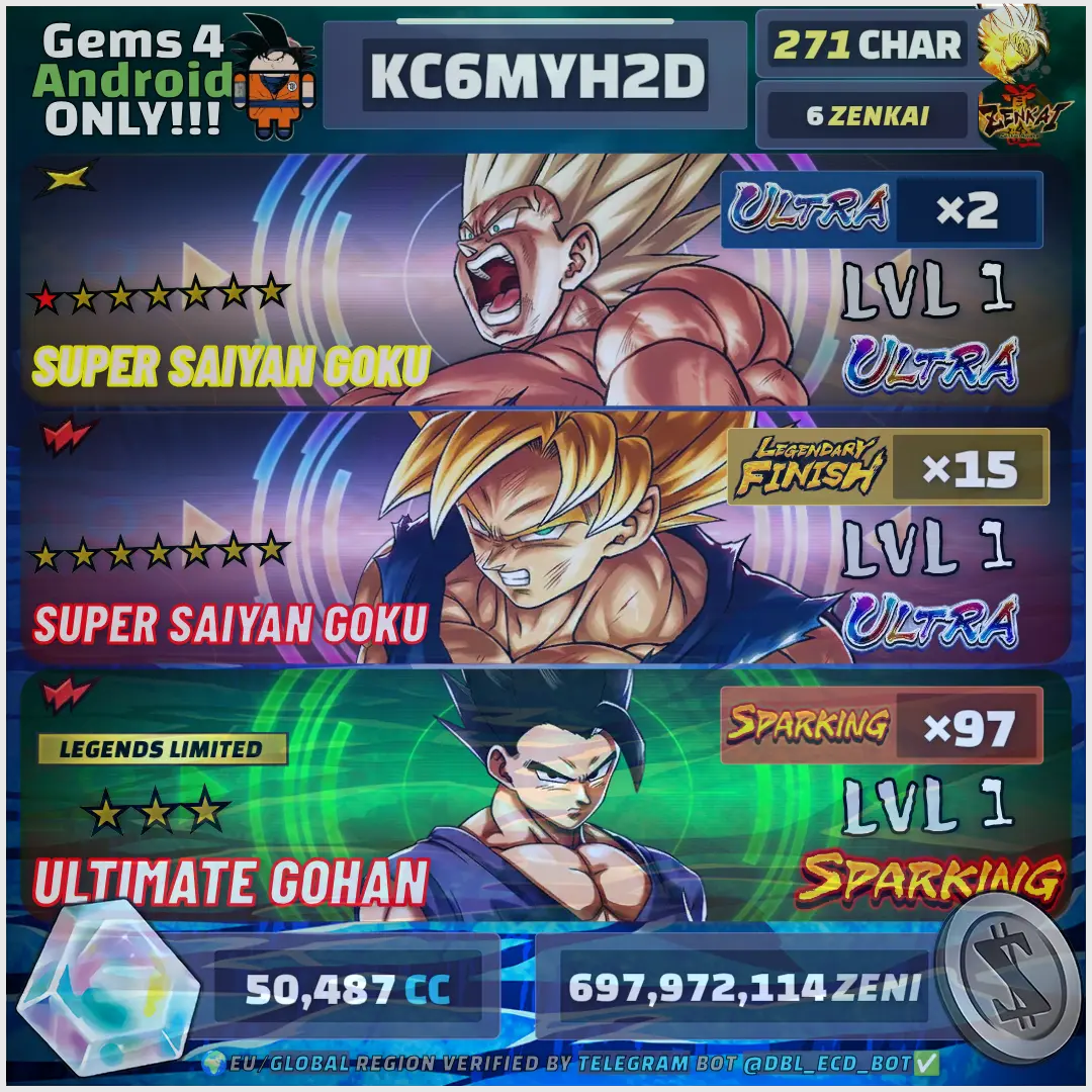 👑 WHALE Legends Collection: [📱 Platform: Android, 👤 Characters: 271, 🌟 Ultra: 2, ⚔️ Sparking: 97, 💎 Crystals: 50487, 👑 Limited: 15, ⚡ Zenkai: 6] ⸱ PREMIUM COLLECTION | GUARANTEED SAFE !AGG02231
