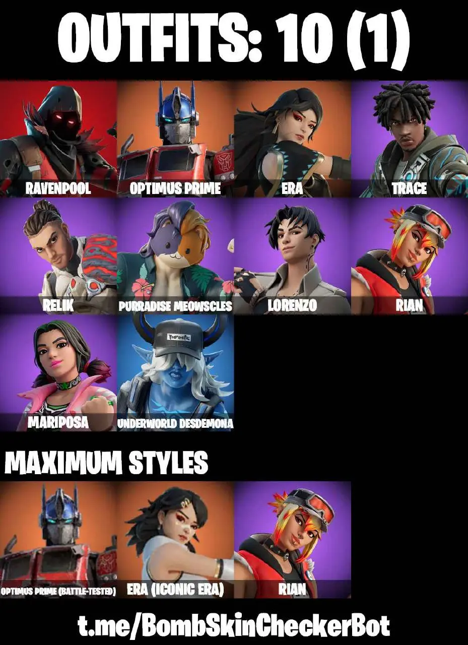 10 Skins✅ Ravenpool, Optimus Prime, Era, Trace, Relik, Purradise Meowscles, Lorenzo, Rian, Mariposa, Underworld Desdemona✅ Full Access