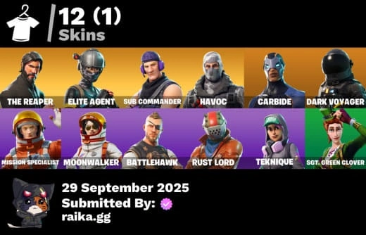 12 skins | The Reaper | Take The L | Elite Agent | Sub Commander | Havoc | Carbide | Dark Voyager | Mission Specialist | Moonwalker | Battlehawk | Rust Lord | Teknique | Sgt. Green Clover | Rust Bucket | Dark Matter | Backup Plan | Fishstick Janky | A2903