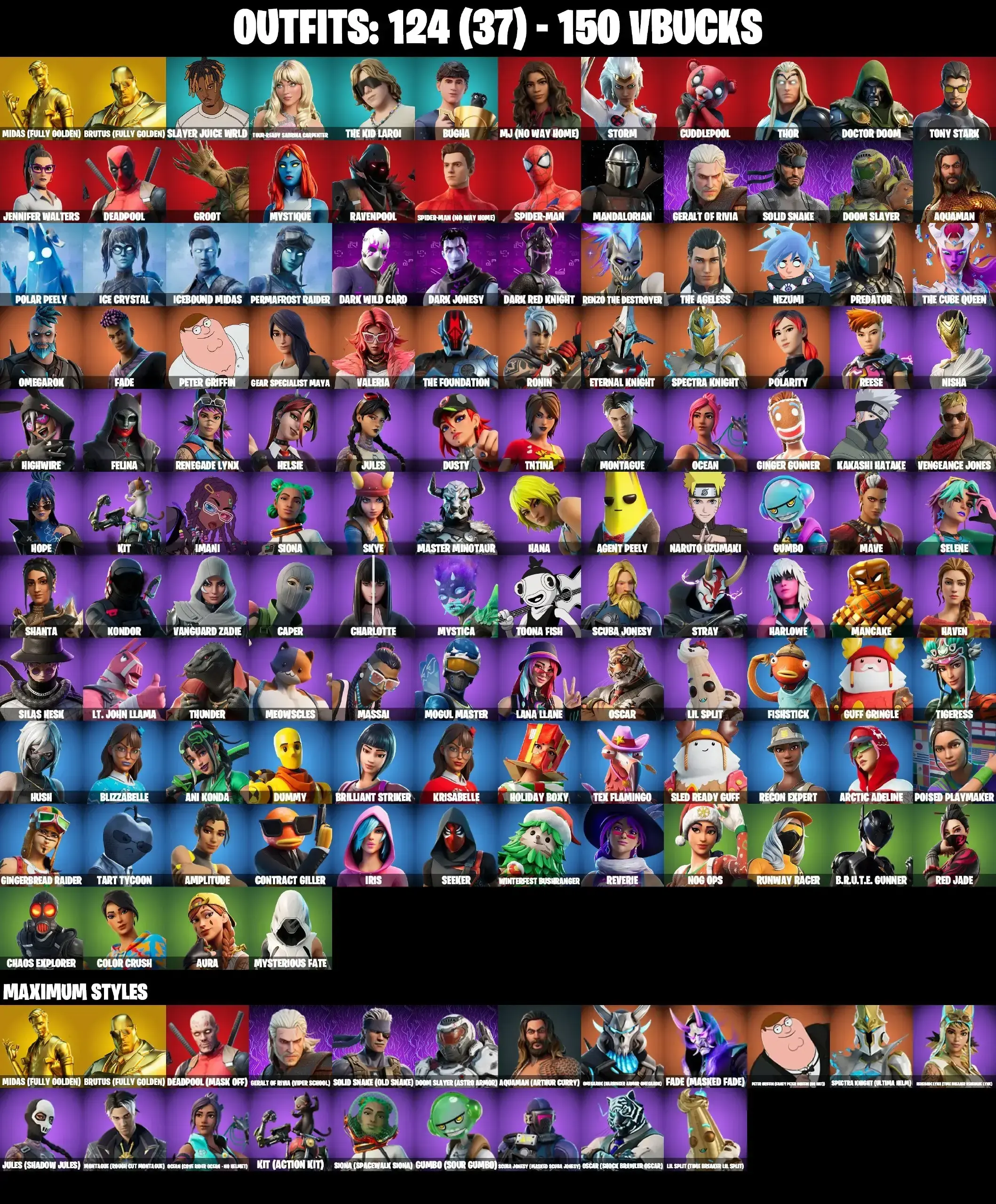 124 SKINS | POLARITY | GO MUFASA | JABBA SWITCHWAY | GET GRIDDY | RAVENPOOL | CUDDLEPOOL | SPIDER-MAN NO WAY HOME | MJ | SPIDER-MAN | GOLDEN MIDAS | STA RWAND | KAKASHI | NARUTO | DUMMY | PREDATOR | MAYA | HELSIE | CHARLOTTE | SIL