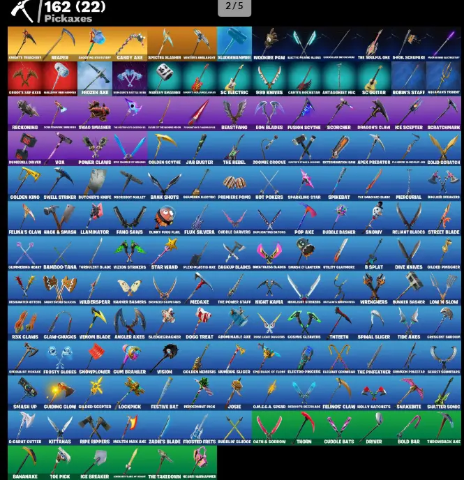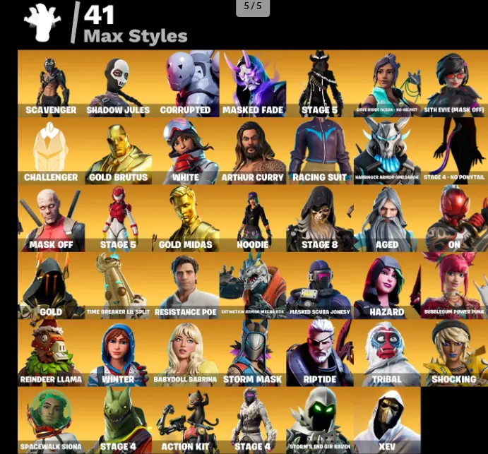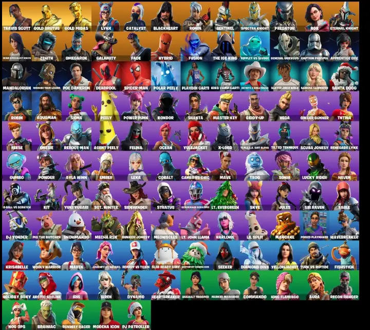 125 Skins 🥷 Travis Scott ⸱ Siren ⸱ Aura ⸱ Dynamo ⸱ Modena Icon ⸱ Nog Ops ⸱ Fishstick ⸱ Poised Playmaker ⸱ Spider-Man ⸱ Iris ⸱ Peely ⸱ Star Wand ⸱ Deadpool 🤝
