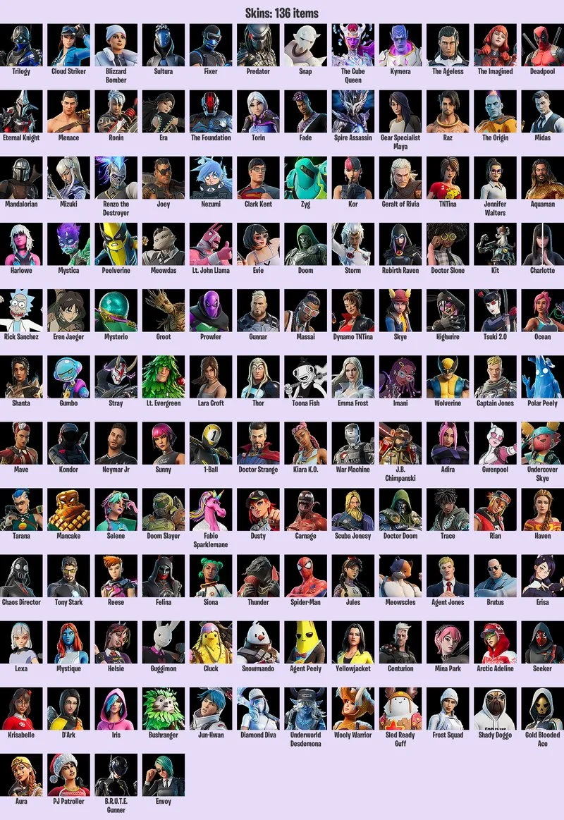 136 Skins|Trilogy|Cloud Striker|Blizzard Bomber|Sultura|Fixer|Predator|Snap|The Cube Queen|Kymera|The Ageless|The Imagined|Deadpool