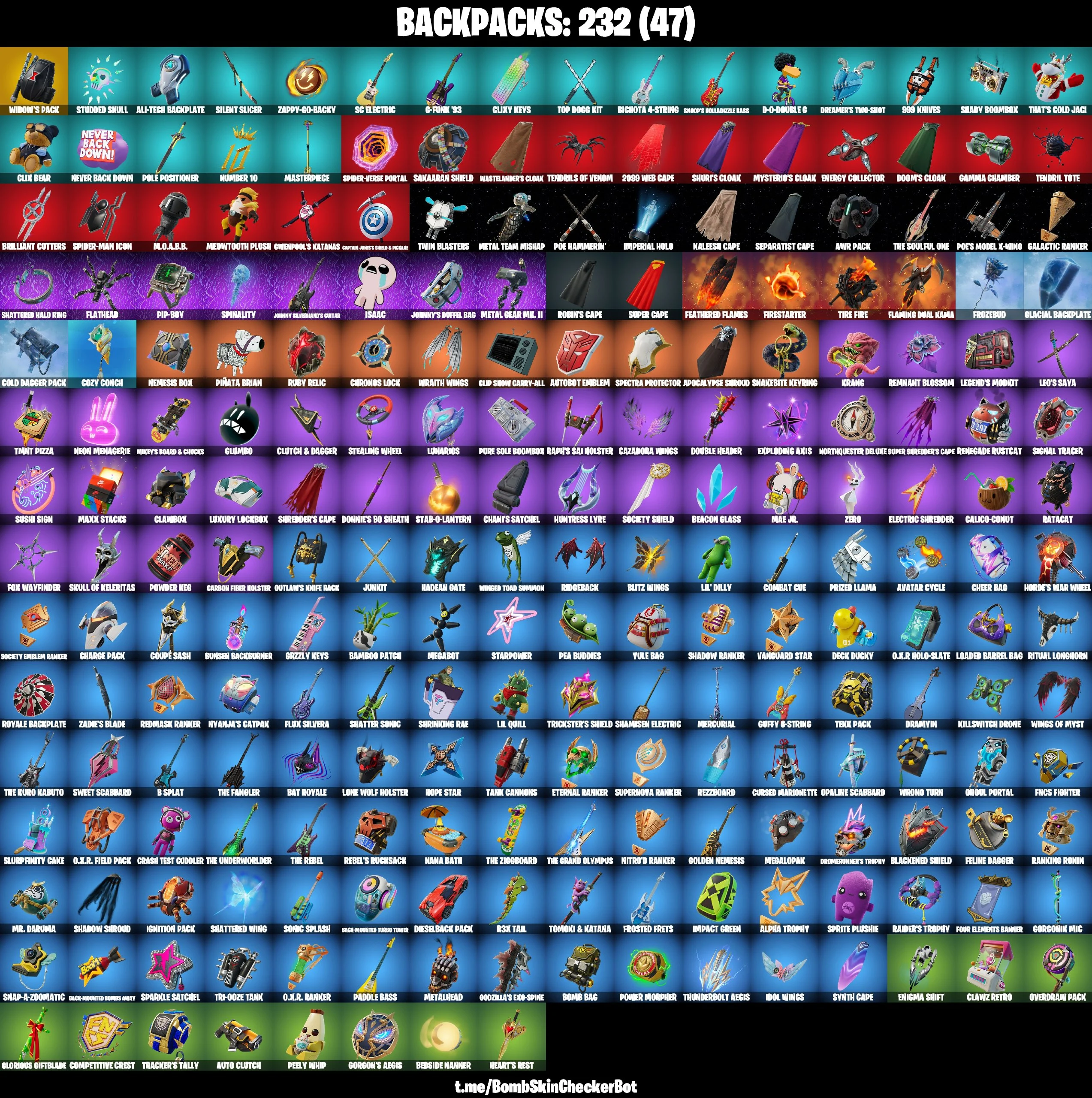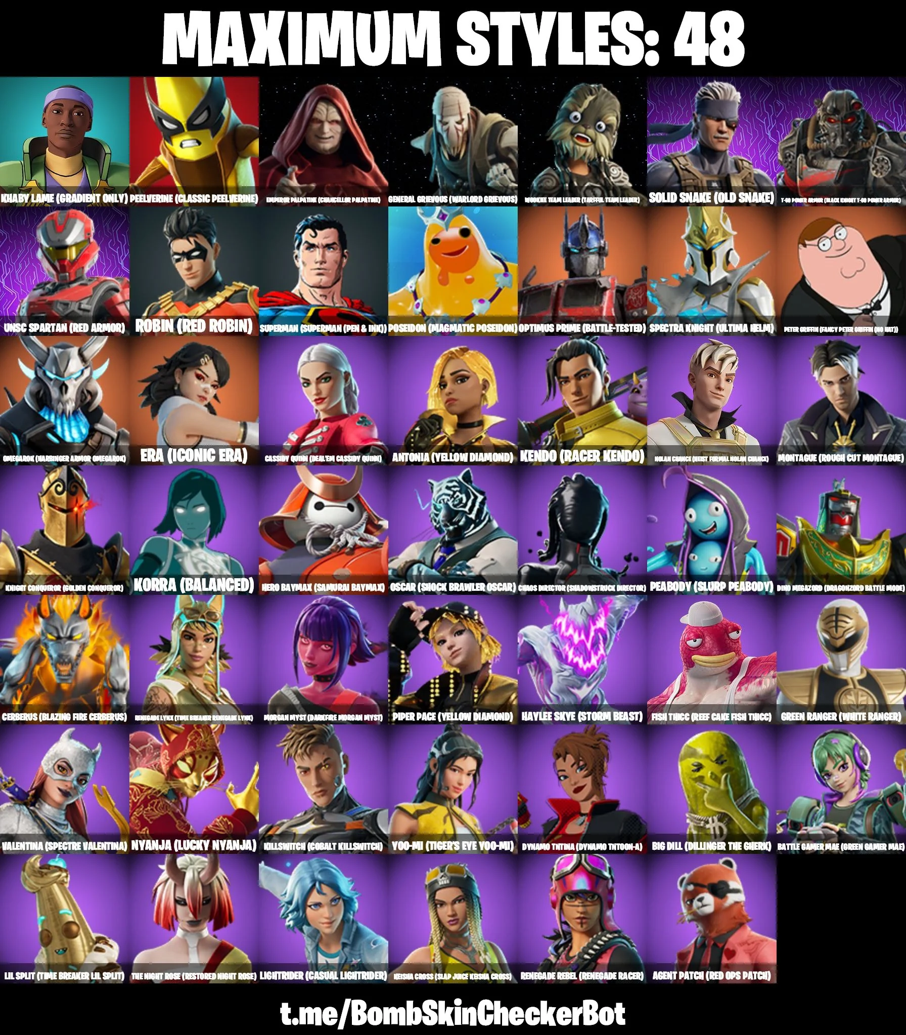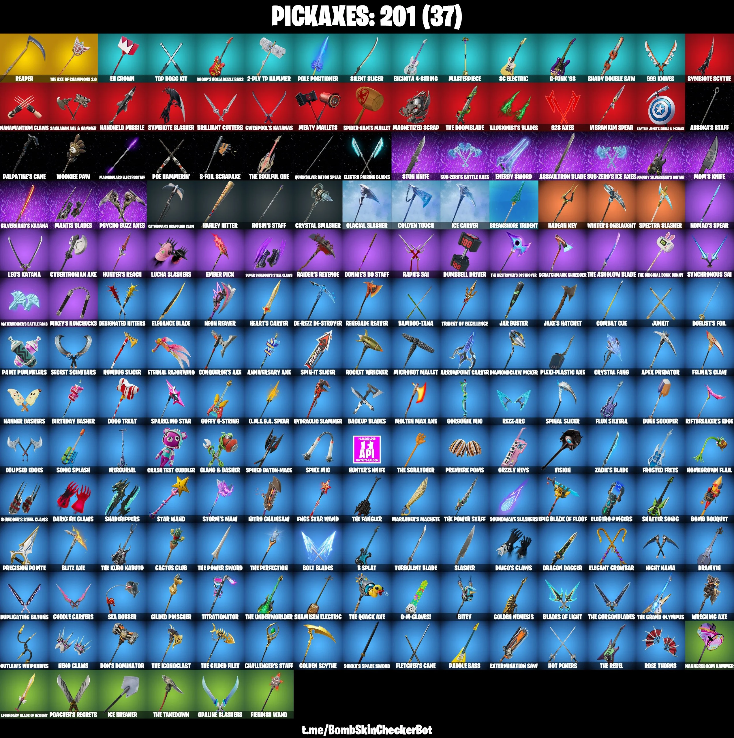 ðŪ202 SkinsðŪ Psycho BanditðRushin AroundðSurf WitchðReaper AxeðStar WandðHarley HitterðEddie BrockðVegetaðAuraðJoltaraðKhaby LameðSpiderman (Miles Morales)ðSpiderman 2099ðSlim ShadyðNord Warrio
