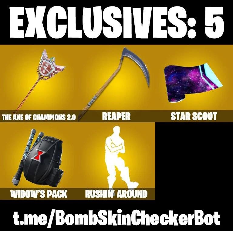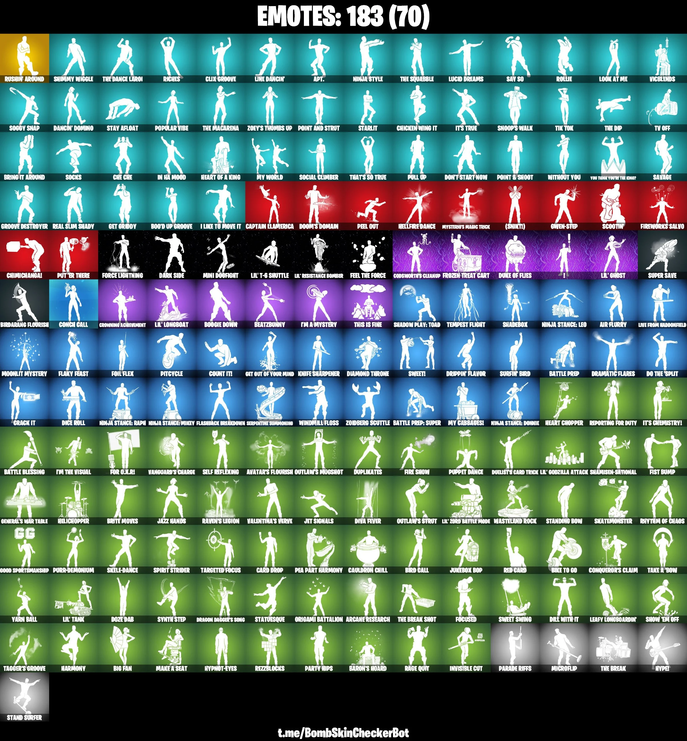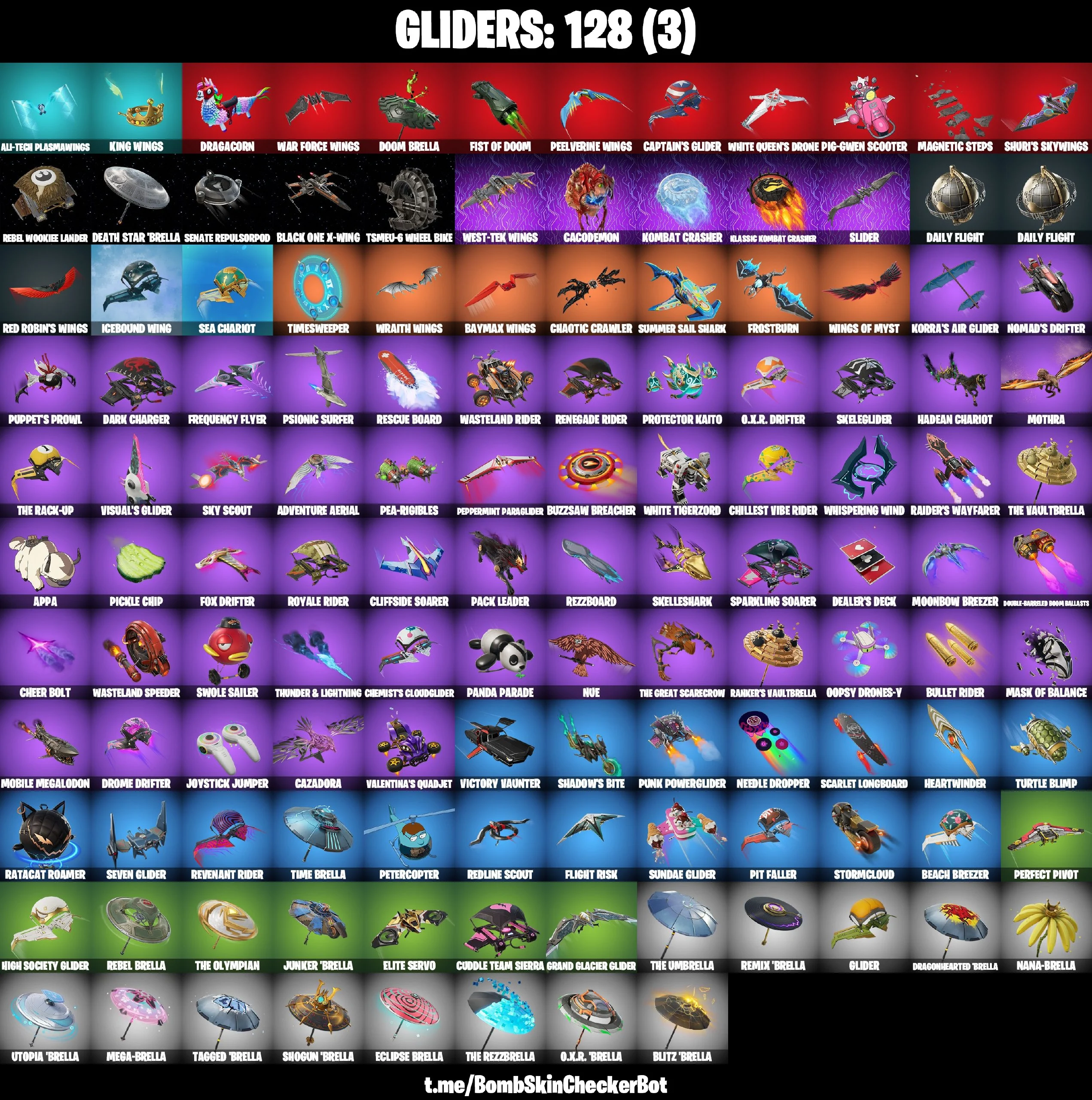 ðŪ202 SkinsðŪ Psycho BanditðRushin AroundðSurf WitchðReaper AxeðStar WandðHarley HitterðEddie BrockðVegetaðAuraðJoltaraðKhaby LameðSpiderman (Miles Morales)ðSpiderman 2099ðSlim ShadyðNord Warrio
