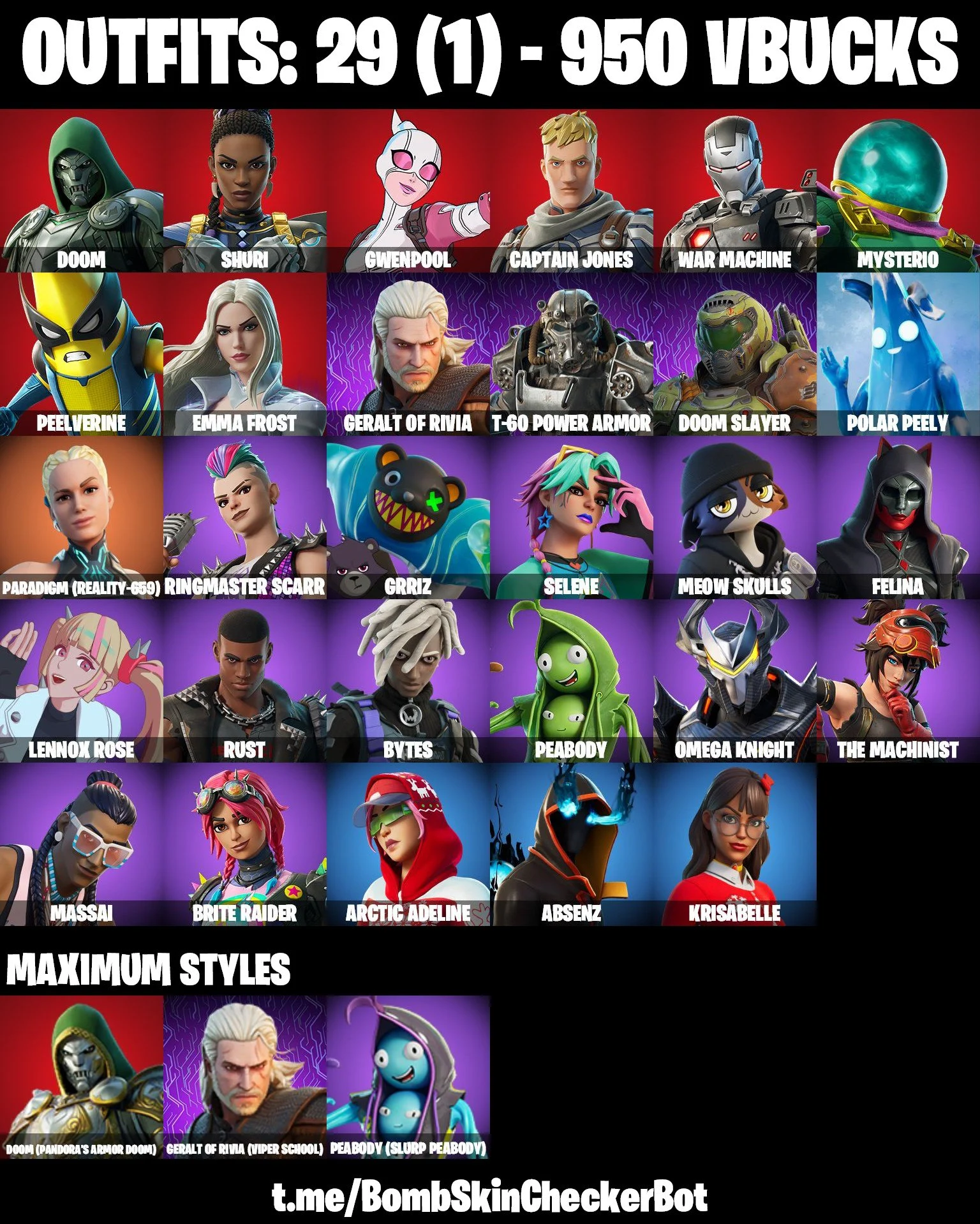 ðŪ29 SkinsðŪ Polar PeelyðKrisabelleðMeow SkullsðDoom SlayerðGeralt Of RiviaðArctic Adeline