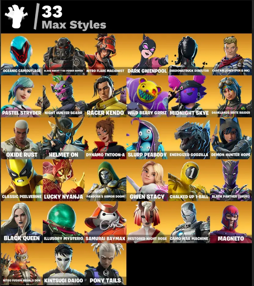 57 skins ⸱ For all platforms | Dummy Supreme | Twyn | Trailblazer Tai | Wastelander Magneto | Shuri | Gwenpool | War Machine | Mysterio | Spider-Gwen | MrBeast6000 | Iron Man Mk 45 | Plungerman | Bird Call