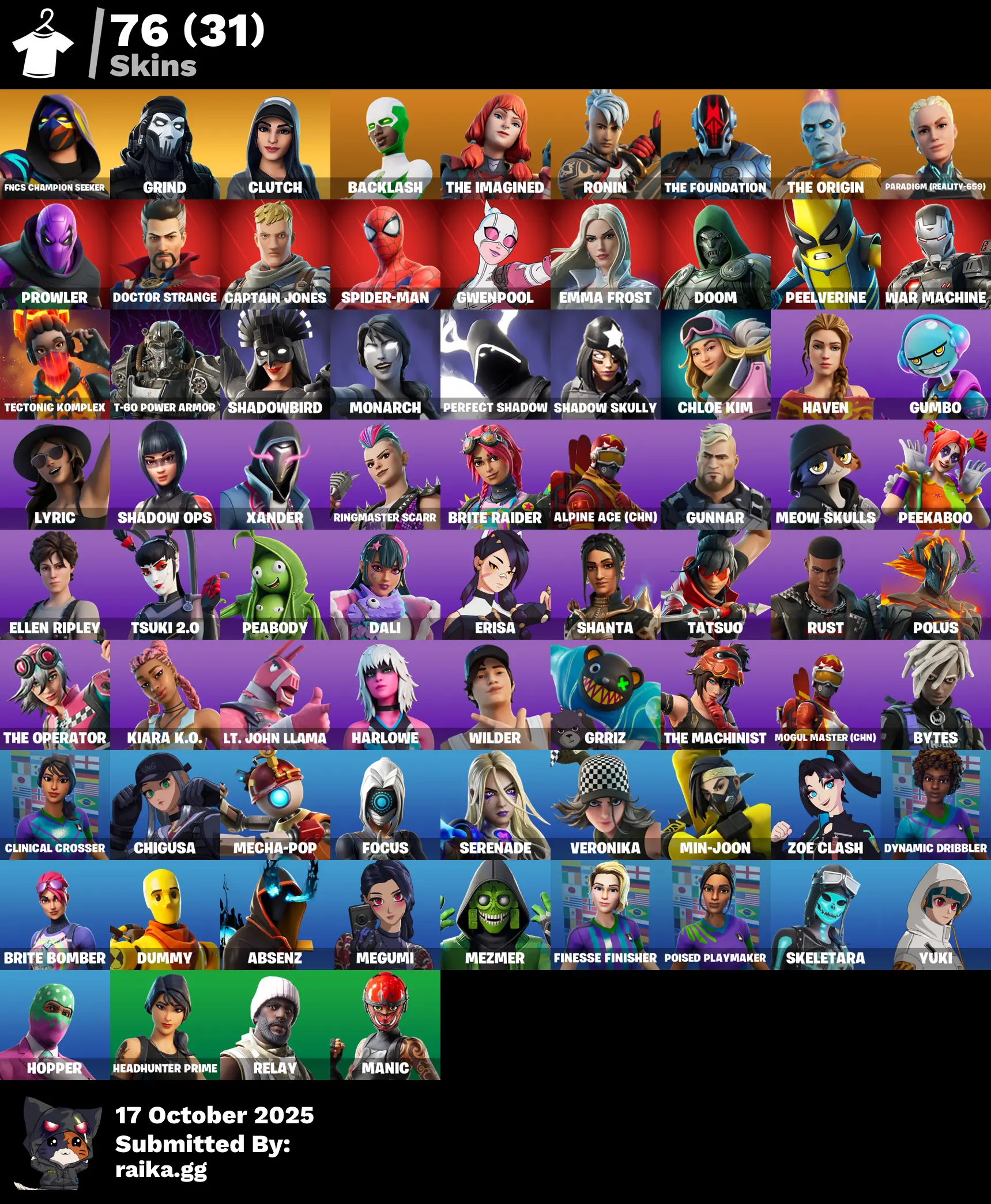 76 skins | Prowler🐔The Origin🐔Ronin🐔Doom🐔Spider-Man🐔Doctor Strange🐔Captain Jones🐔Grind🐔Emma Frost🐔The Imagined🐔War Machine🐔Peelverine🐔The Foundation🐔Backlash🐔T-60 Power Armor🐔Tectonic Komplex🐔Paradigm (Reality-659)🐔Clutch🐔Gwenpool D5137
