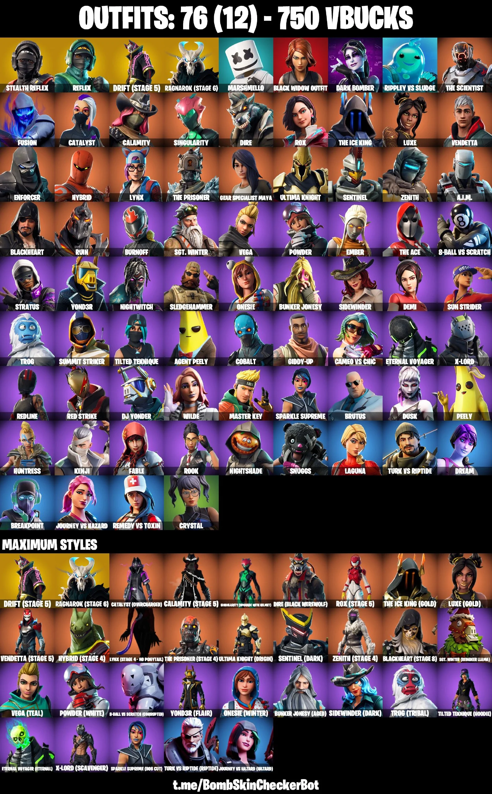 76 Skins| Stealth Reflex, Black Widow, Reflex, Ragnarok S6, Drift Stage 5, Crystal, Crowbar|Full Access