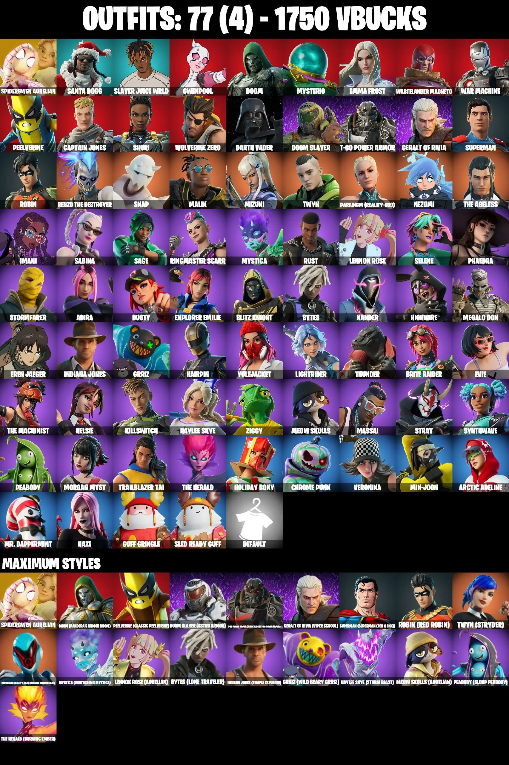 77 SKINS | SPIDER-GWEN STACY | DARTH VADER | GO MUFASA | GET GRIDDY | STAR WAND | SUPERMAN MAX | EREN JAEGER | MYSTICA MAX | HAYLEE SKYE MAX | HELSIE | PHAEDRA | EVIE | MEOW SKULLS MAX | CAN PLAY ON PSN,XBOX,PC,NINTENDO,MOBILE | 1
