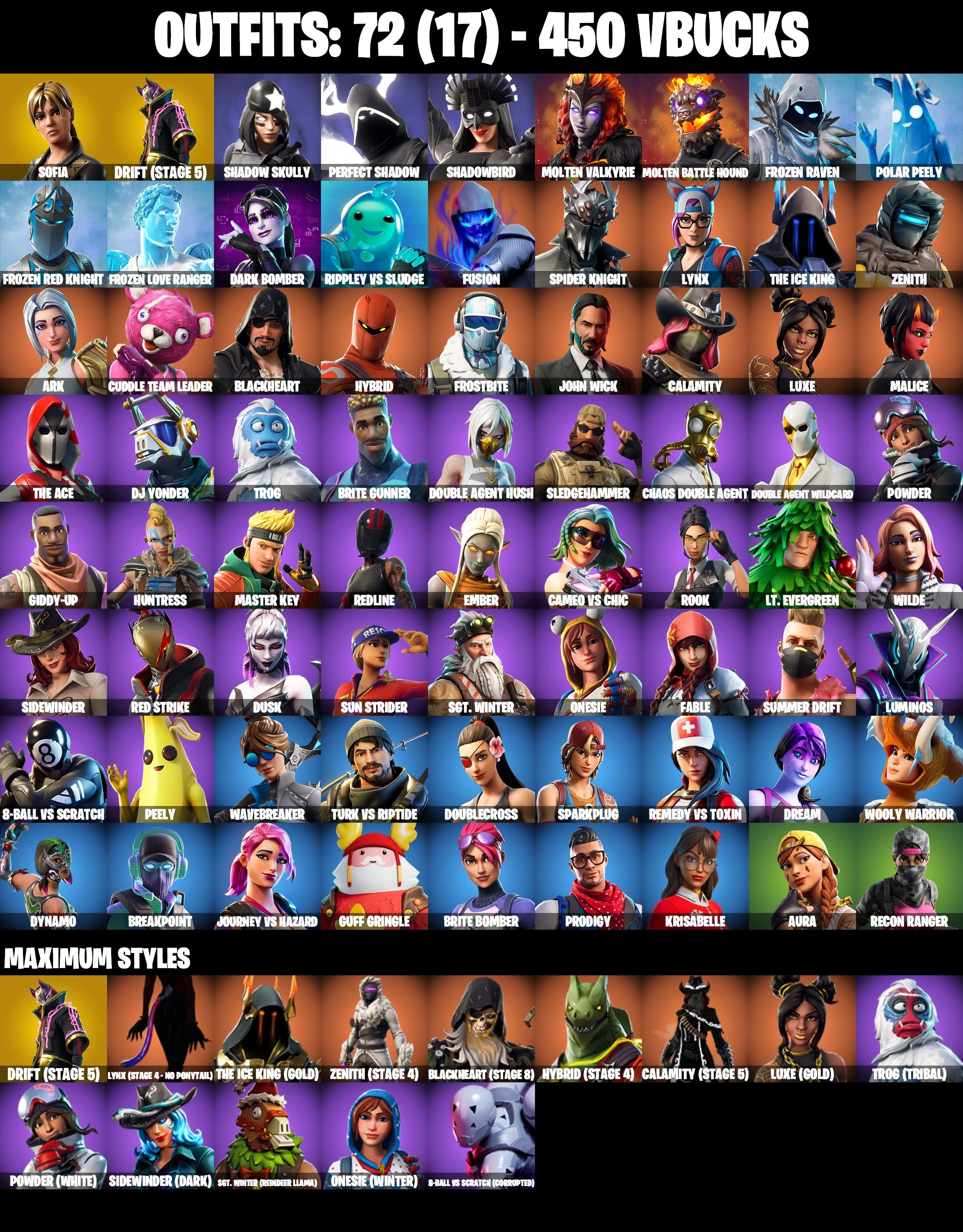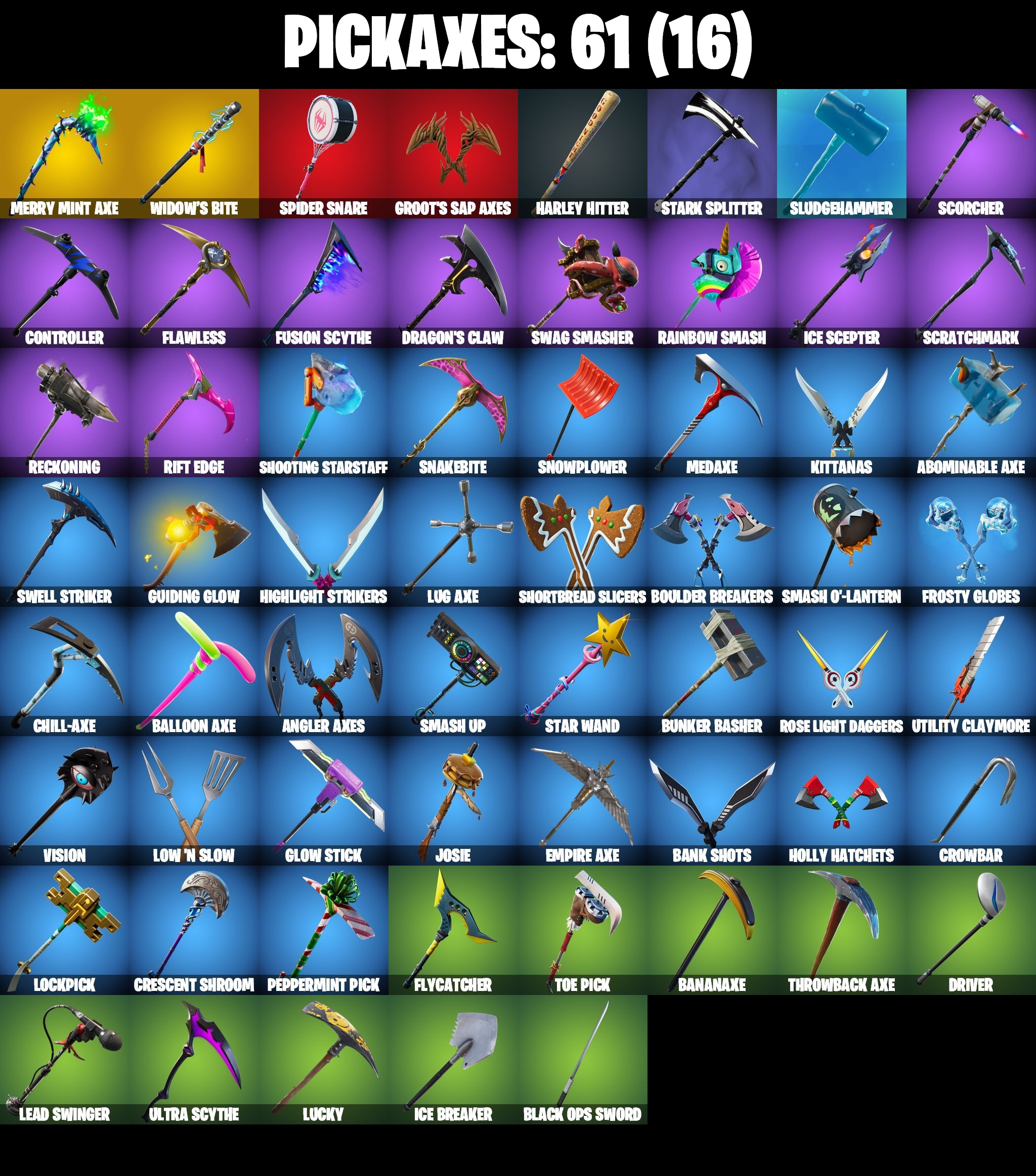 EMAIL CHANGEABLE ✅ [ALL PLATFORMS] ⚡ 72 SKINS 💎 MERRY MINTY PICKAXE 💜 TAKE THE ELF 💜 DRIFT STAGE 5 💜 STAR WAND 💜 HARLEY HITTER 💜 CROWBAR 💜 FLAPPY 💜 AURA