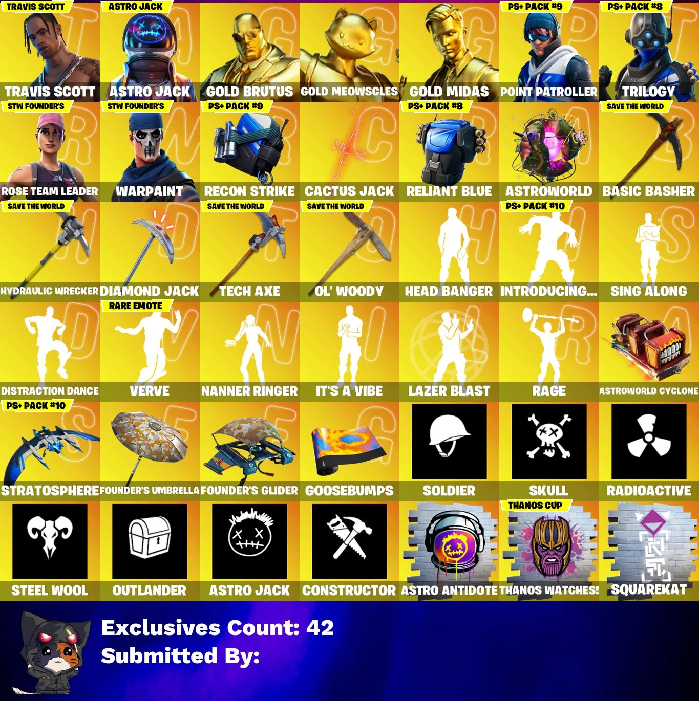 💥🌟 EXCLUSIVE OFFER 🌟💥 207 SKINS 💎 TRAVIS SCOTT 💎 ASTRO JACK 💎 GOLD BRUTUS 💎 GOLD MEOWSCLES 💎 GOLD MIDAS 💎 POINT PATROLLER 💎 TRILOGY 💎 RAVEN 💎 THE IMAGINED 💎 KYMERA 💎 JOEY 💎 KADO THORNE 💎 OG STW 💎 FULL ACCESS 💎