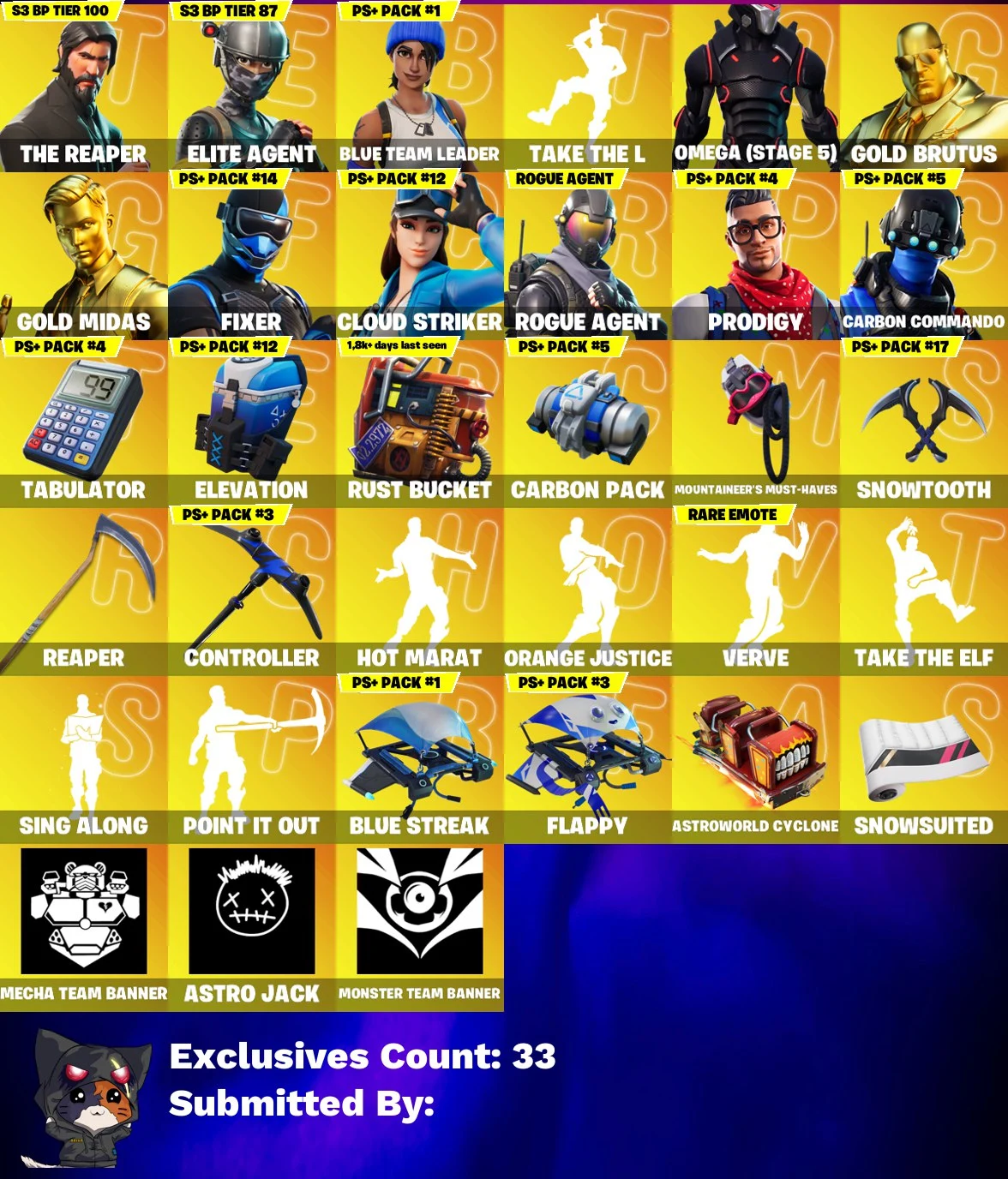 🛡️👑 OG ACCOUNT 👑🛡️ 103 SKINS 💎 THE REAPER 💎 ELITE AGENT 💎 TAKE THE L 💎 OMEGA (STAGE 5) 💎 GOLD BRUTUS 💎 GOLD MIDAS 💎 FIXER 💎 CLOUD STRIKER 💎 ROGUE AGENT 💎 PRODIGY 💎 CARBON COMMANDO 💎 VALOR 💎 DRIFT 💎 JOEY 💎 CARBIDE 💎 ZENITH 💎 250 VB 💎 FULL ACCESS 💎