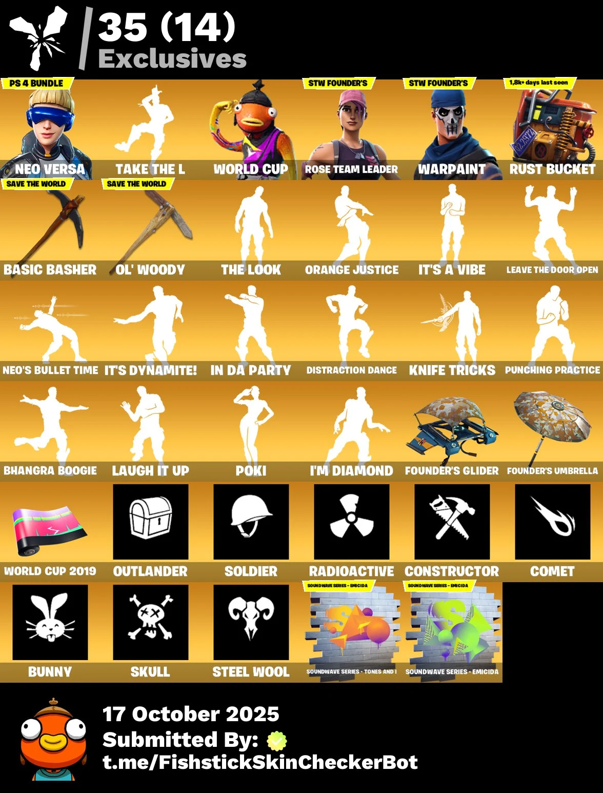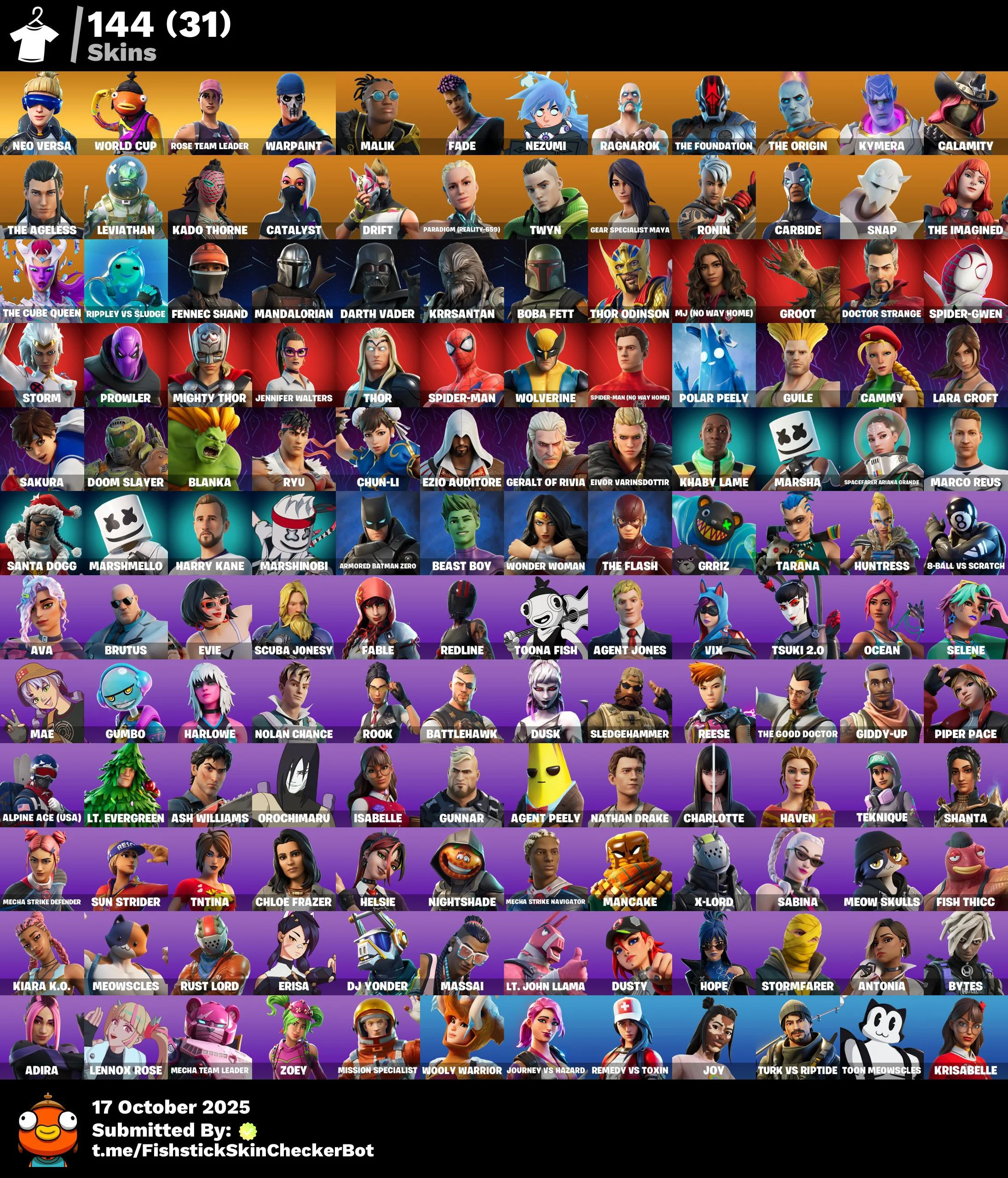 [PC] 144 skins | OG STW | 318 paid Dances | Orochimaru | Street Fighter Skins | Take The L | Neo Versa | WORLD CUP | Malik | Fade | Nezumi | Ragnarok | The Foundation | The Origin | Kymera | Calamity | The Ageless | 200 VB