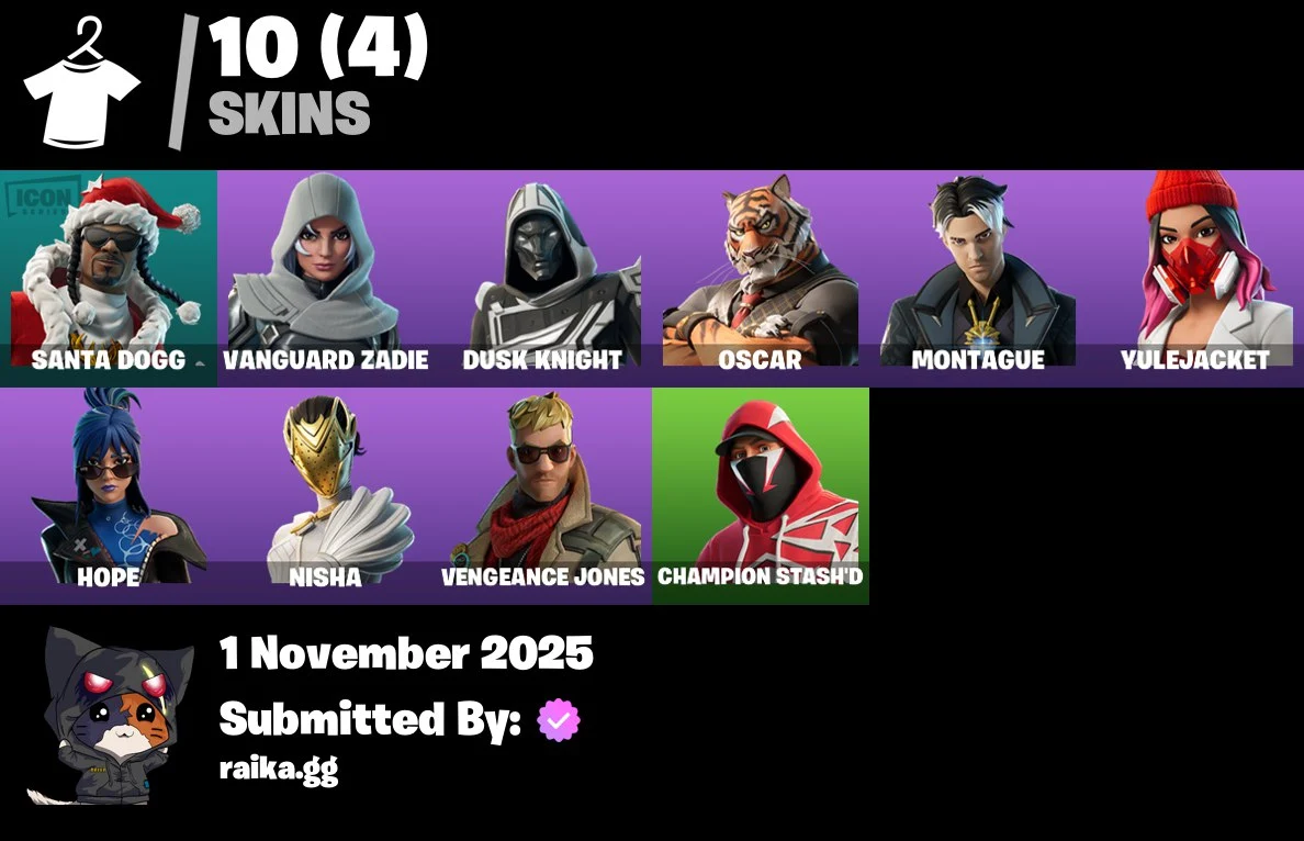 [PC/PSN/XBOX] 10 skins | Santa Dogg | Vanguard Zadie | Blitz Knight | Oscar | Montague | Yulejacket | Hope | Nisha | Vengeance Jones | Champion Stash'd | 950 VB