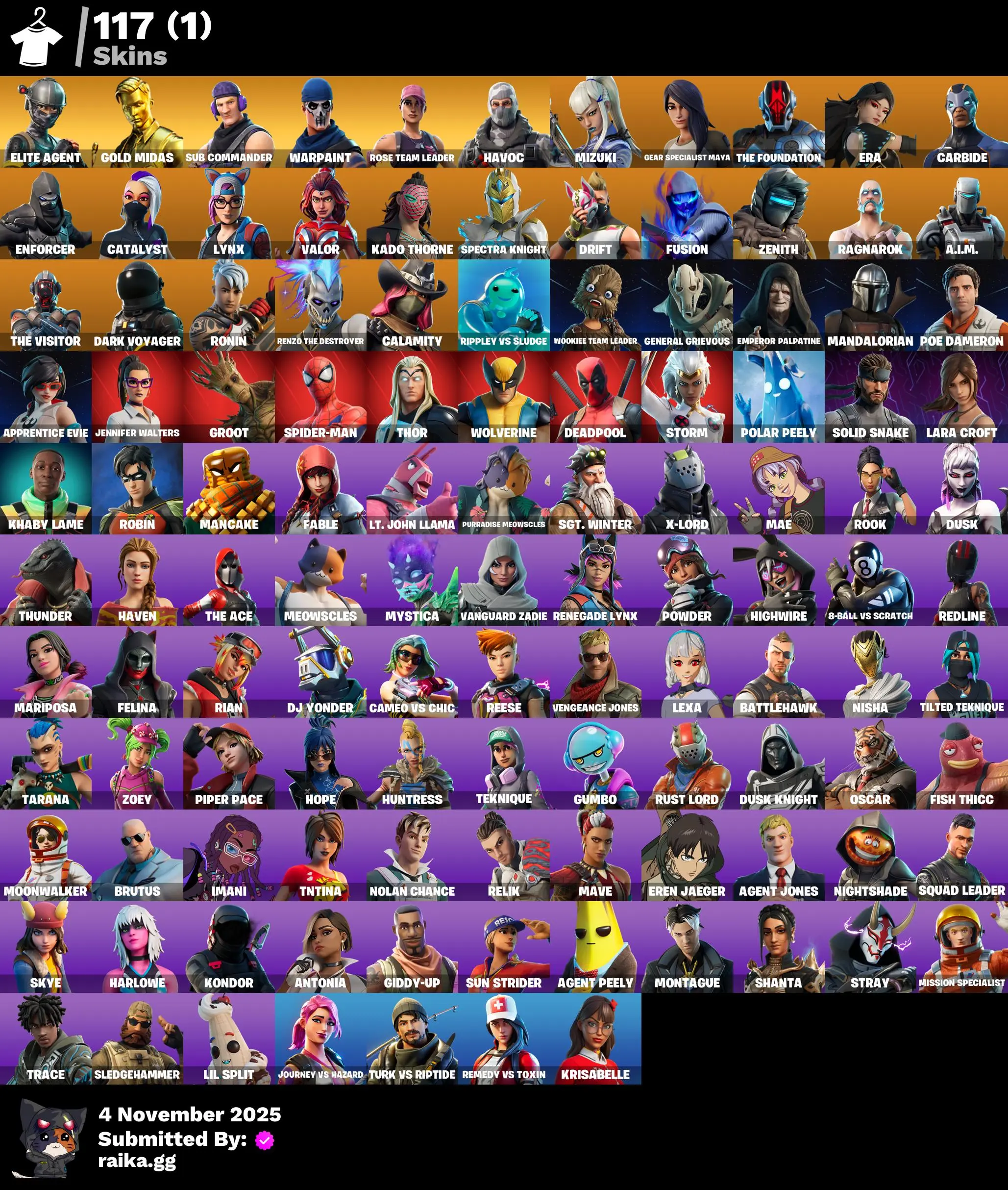 [PC/PSN/XBOX] 117 skins | OG STW | Elite Agent | Gold Midas | Sub Commander | Havoc | Mizuki | Gear Specialist Maya | The Foundation | Era | Carbide | Enforcer | 1250 VB