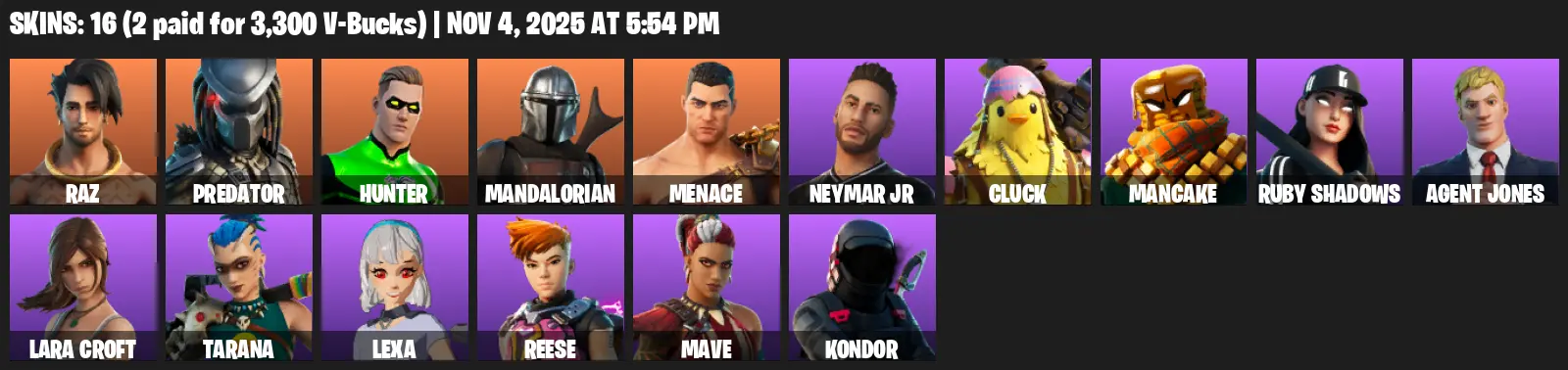 [PC/PSN/XBOX] | 16 skins | Lara Croft | Raz | Predator | Hunter | Mandalorian | Menace | Neymar Jr | Cluck | Mancake | Ruby Shadows | S4G