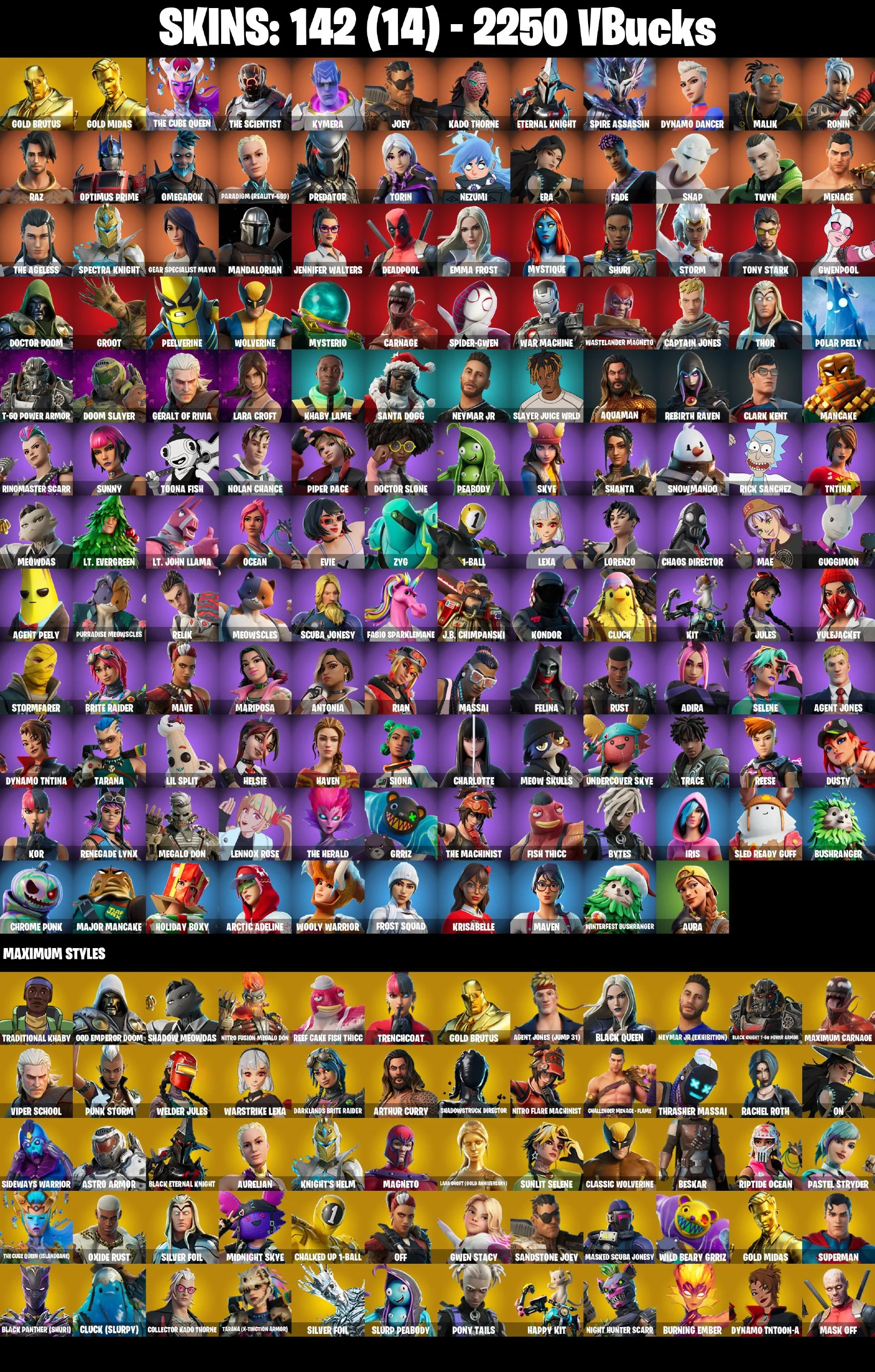 (PC/PSN/XBOX) 2250 VB) 142 SKINS / Gold Brutus | Gold Midas | The Cube Queen | The Scientist | Kymera | Joey | Kado Thorne | Eternal Knight / | PARENTAL CONTROL