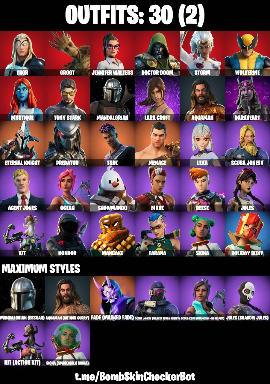 ✅PC/PSN/XBOX✅ 30 Skins✅ Tony Stark, Lara Croft, Jules, Predator, Jennifer Walters, Mandalorian, Siona, Ocean, Holiday Boxy✅ 200 Vbucks✅ Full Access