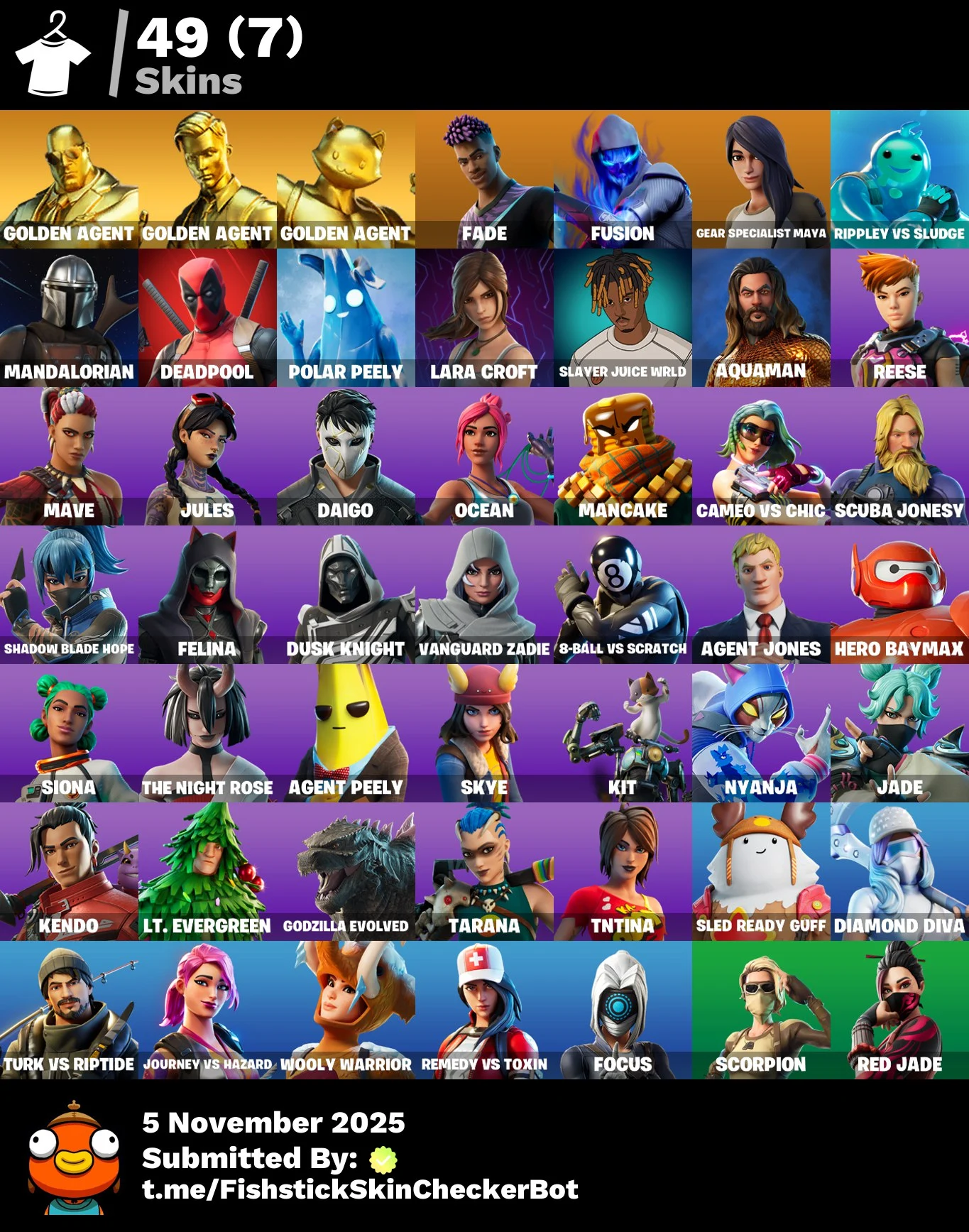 [PC/PSN/XBOX] 49 skins | Gold Brutus | Gold Midas | Gold Meowscles | Lara Croft | Fade | Fusion | Gear Specialist Maya | Rippley vs Sludge | Mandalorian | Deadpool | 100 VB