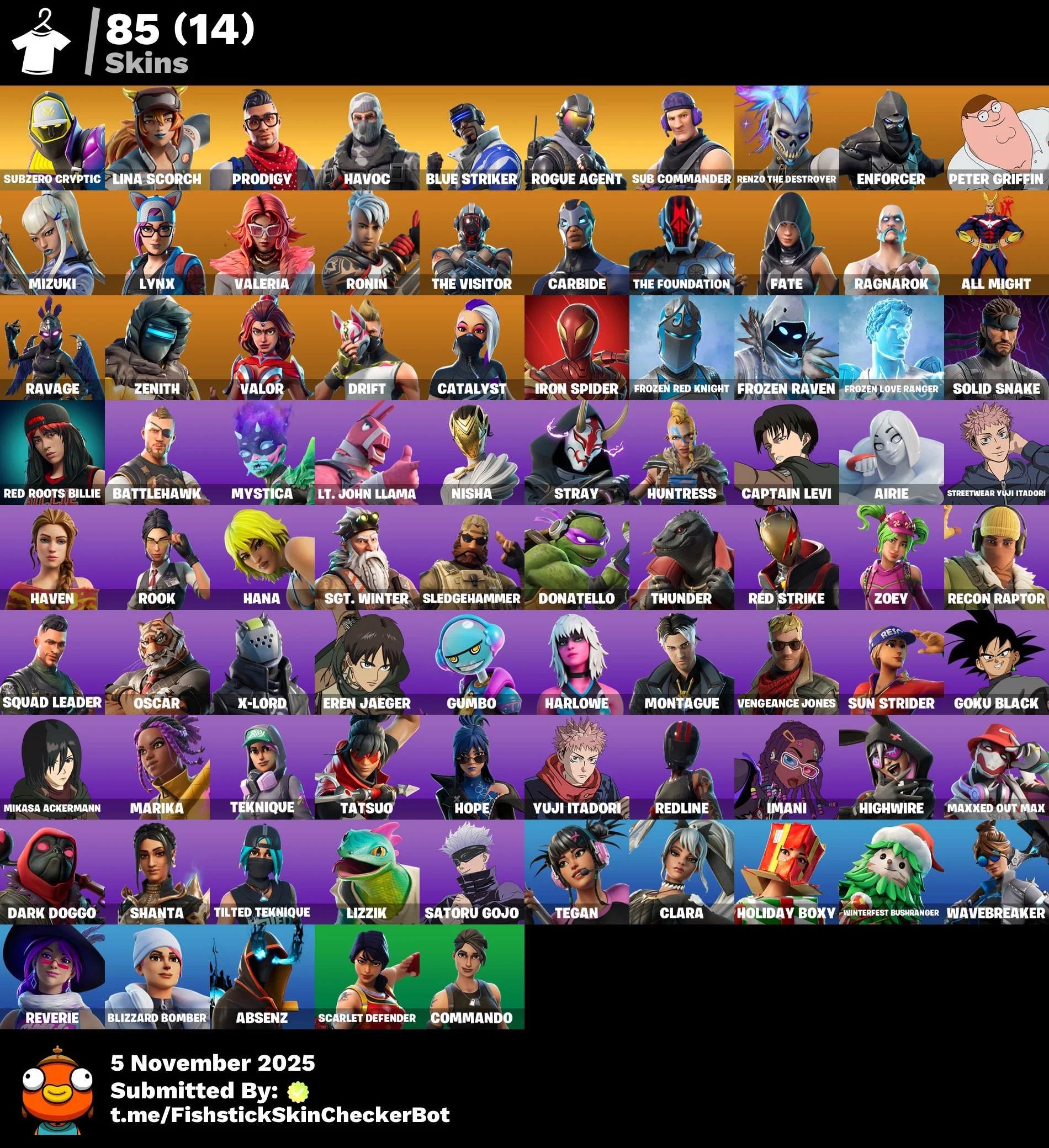 [PC/PSN/XBOX] 85 skins | Mikasa Ackerman | Captain Levi | Eren Yager | Subzero Cryptic | Lina Scorch | Prodigy | Havoc | Blue Striker | Rogue Agent | Sub Commander | Renzo the Destroyer | Enforcer | 2100 VB