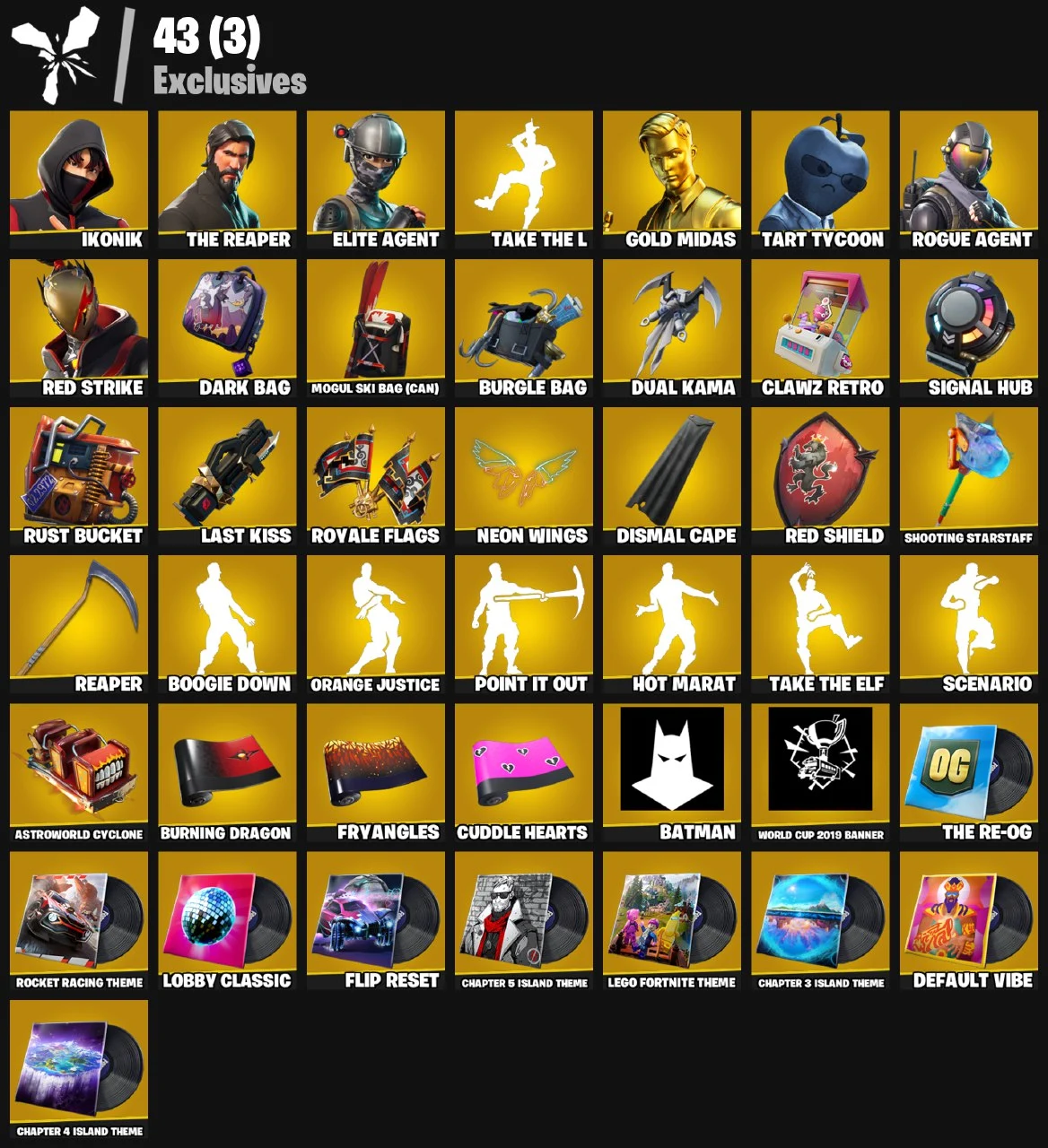 ⭕PC/PSN/XBOX⭕92 Skins + IKONIK + The Reaper + Elite Agent + Rogue Agent + Drift + Calamity + Take The L + OMEGA + IRIS + Laguna + Orange Justice + Point it out + Scenario + Tart Tycoon | 1,400 V-Bucks |