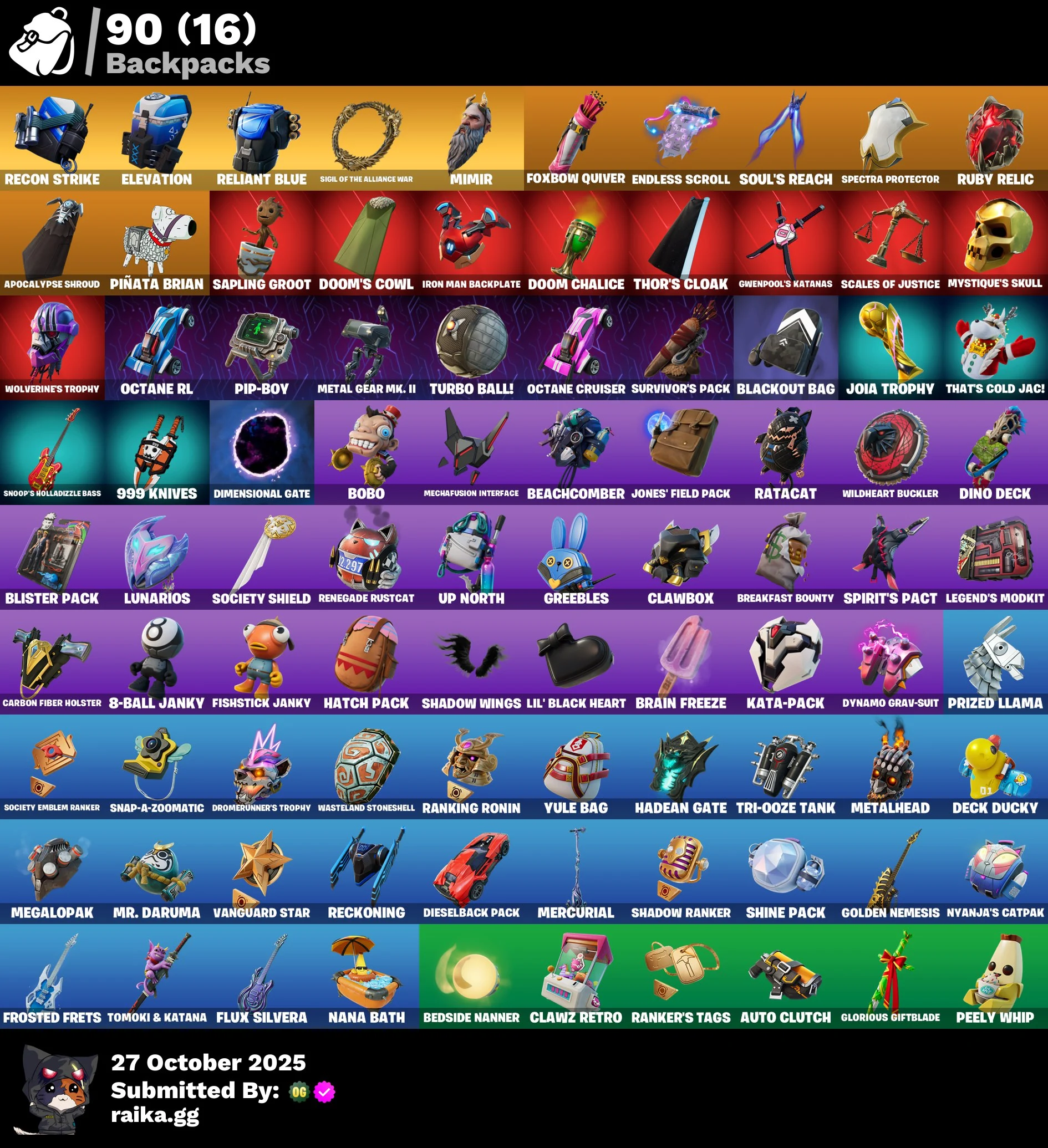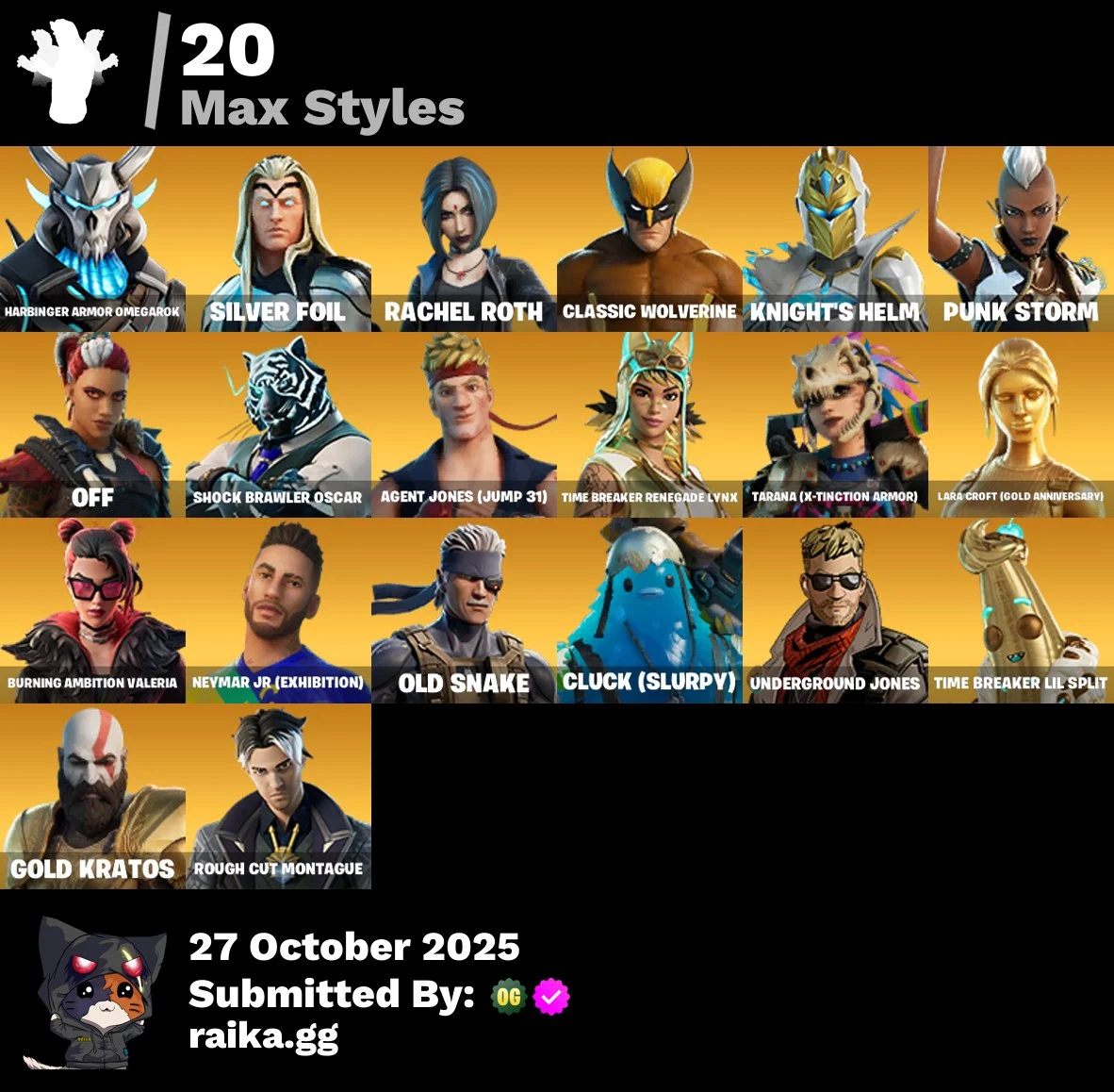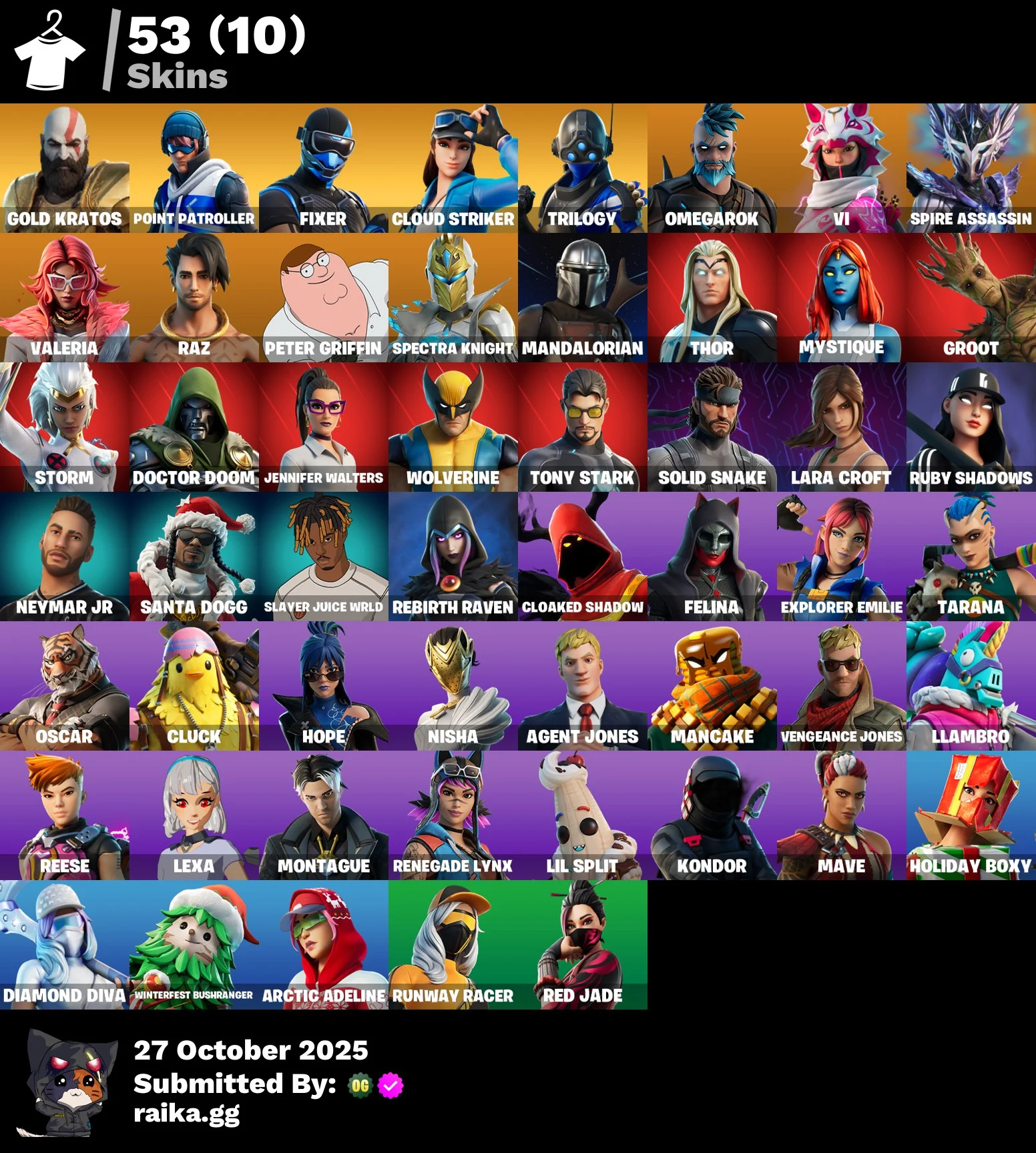 PC/PSN/Xbox/Nintendo 53 skins | Leviathan Axe | Gold Kratos | Point Patroller | Fixer | Cloud Striker | Trilogy | Omegarok | Vi | Spire Assassin | Valeria | Raz | Peter Griffin | 250 VB