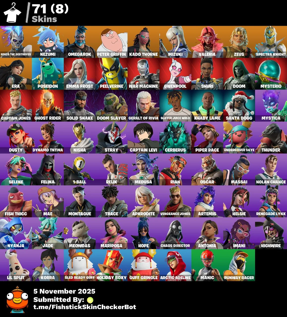 [PC/PSN/XBOX/NINTENDO] 71 skins | Captain Levi | Renzo the Destroyer | Nezumi | Omegarok | Peter Griffin | Kado Thorne | Mizuki | Valeria | Zeus | Spectra Knight | Era | Poseidon | 700 VB