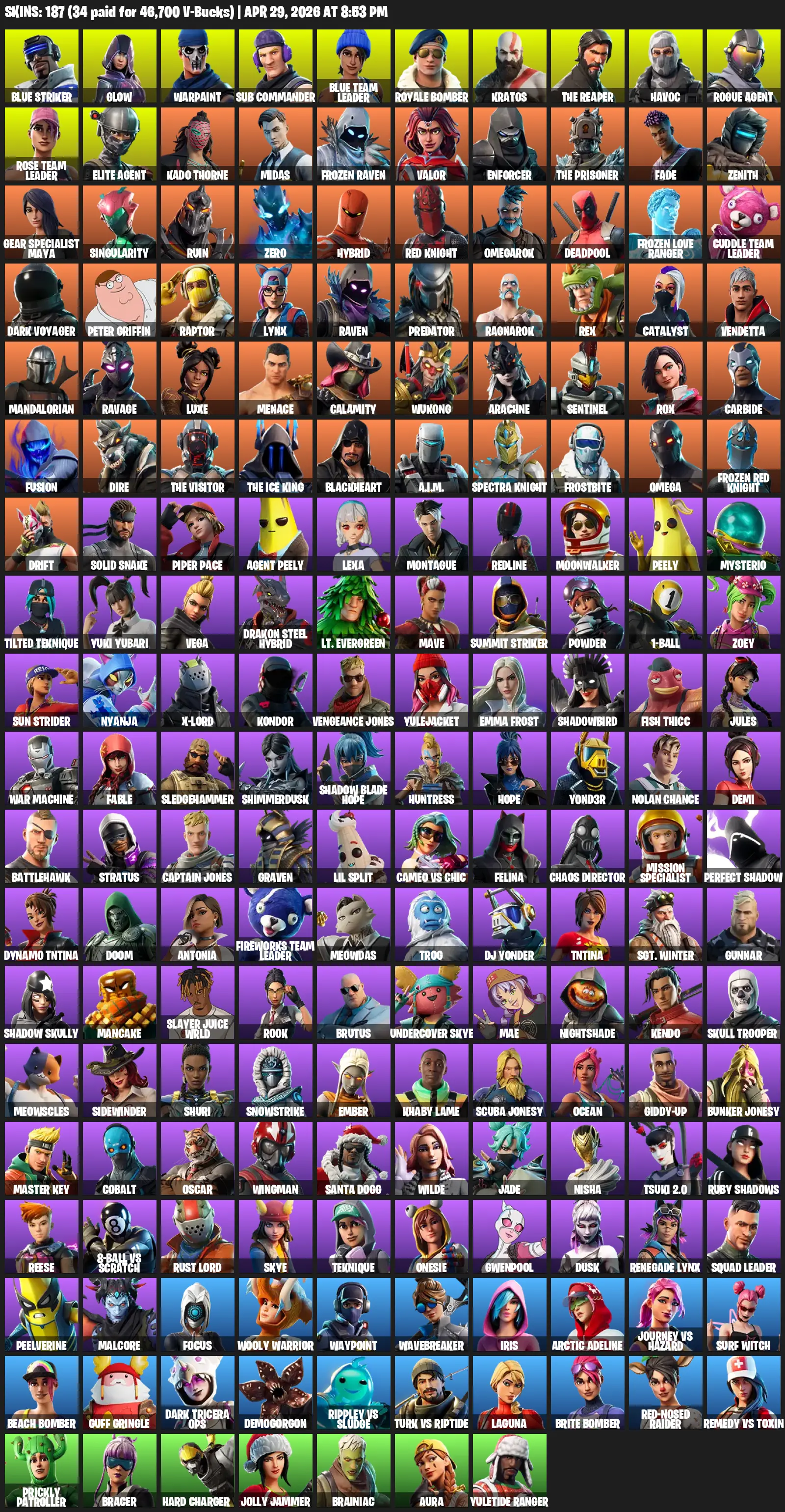 [PC/XBOX] | 187 skins | 900 V-bucks | Leviathan Axe | Take The L | OG STW | The Reaper | Elite Agent | Omega | Blue Striker | Glow | #BHU0030