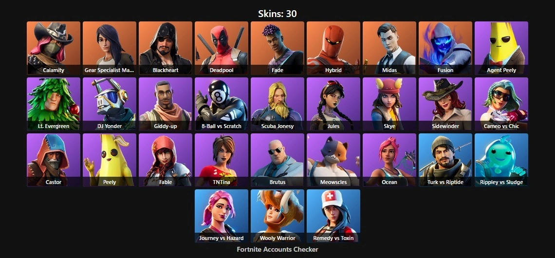 PC/XBOX 30 Skinsâïļ | Deadpool | Midas | Peely | Calamity | Gear Specialist Maya | Blackheart | Fade | Hybrid | Fusion | Agent Peely | Lt. Evergreen