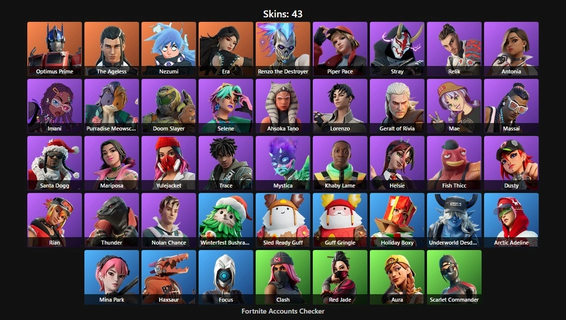 PC/XBOX/PSN 43 Skins⚡ | Optimus Prime | The Ageless | Nezumi | Era | Renzo the Destroyer | Piper Pace | Stray | Relik | Antonia | Imani | Purradise Meowscles