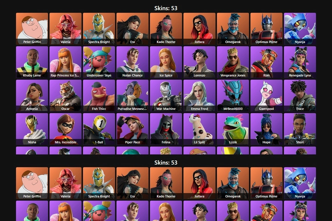 PC/XBOX/PSN 53 Skins⚡ | Peter Griffin | Valeria | Spectra Knight | Era | Kado Thorne | Joltara | Omegarok | Optimus Prime | Nyanja | Khaby Lame