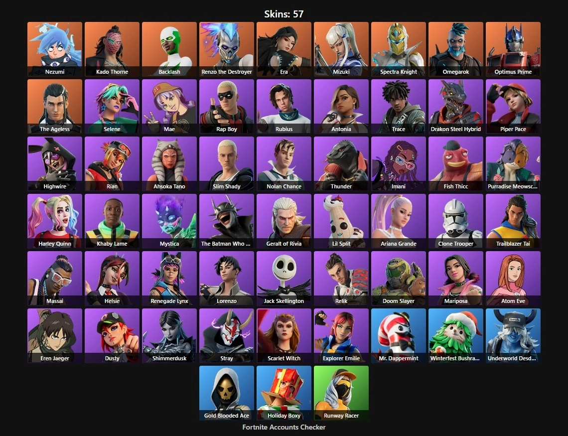 PC/XBOX/PSN 57 Skins⚡ | Nezumi | Kado Thorne | Backlash | Renzo the Destroyer | Era | Mizuki | Spectra Knight | Omegarok | Optimus Prime | The Ageless