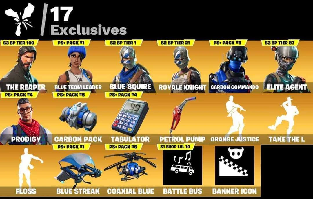 [PSN/XBOX/PC/Mobile] 50 skins | the reaper | blue team leader| blue squire | royale knight | elite agent | prodigy | orange justice | take the L | floss | battle bus | 0 vbucks
