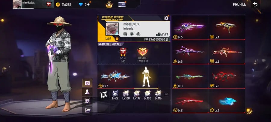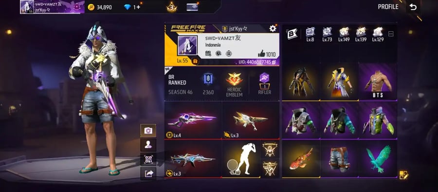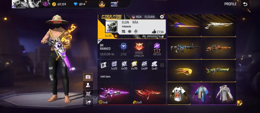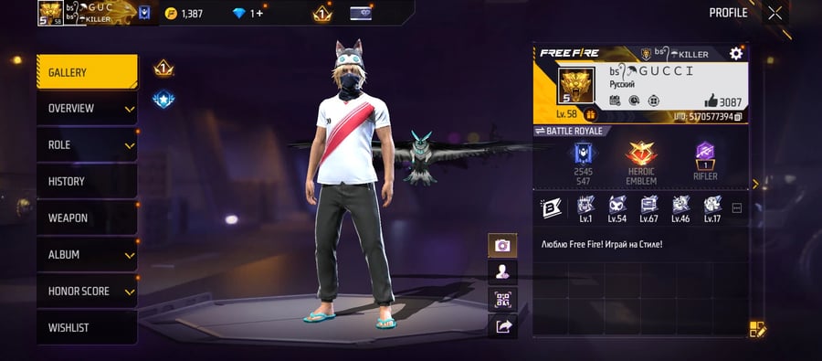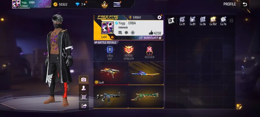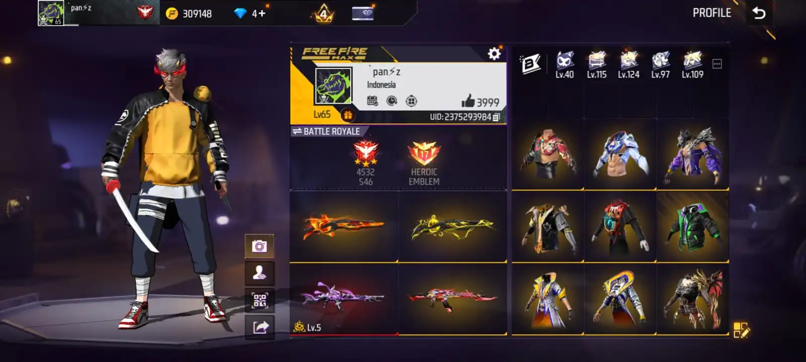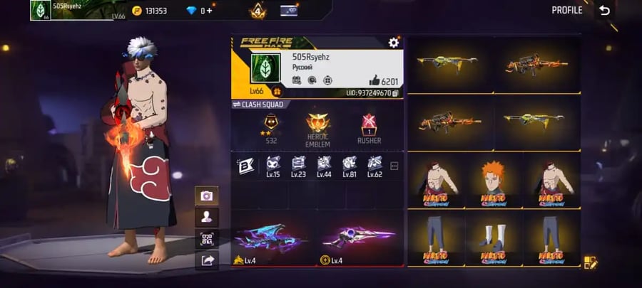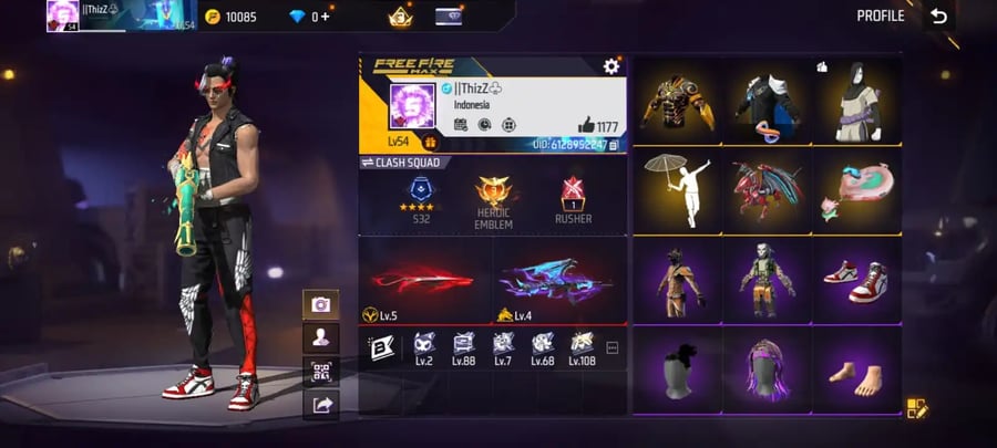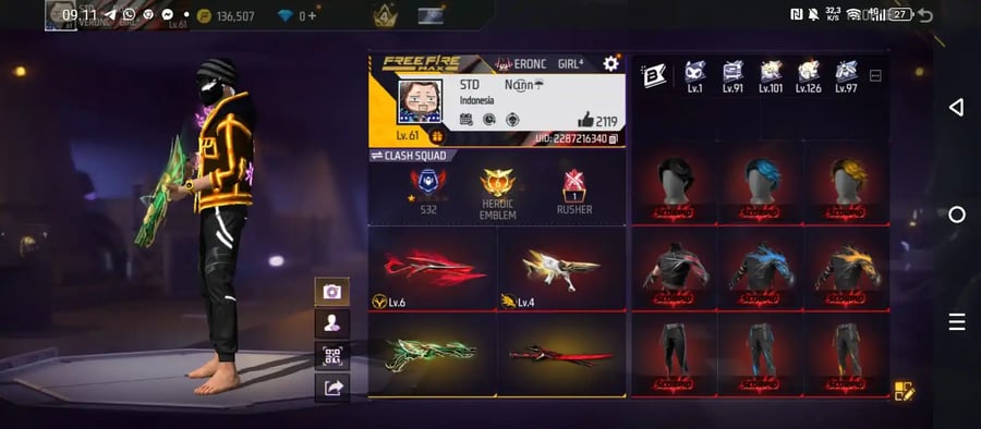 V18|LVL65|499COSTUME(46MYTHIC)|515WEAPON(1EVO+93MYTHIC)|EVILHOWLER-AN94LVL5|BOOYAHDAY-UMPLVL4|INCENDIUMBURST-M1887