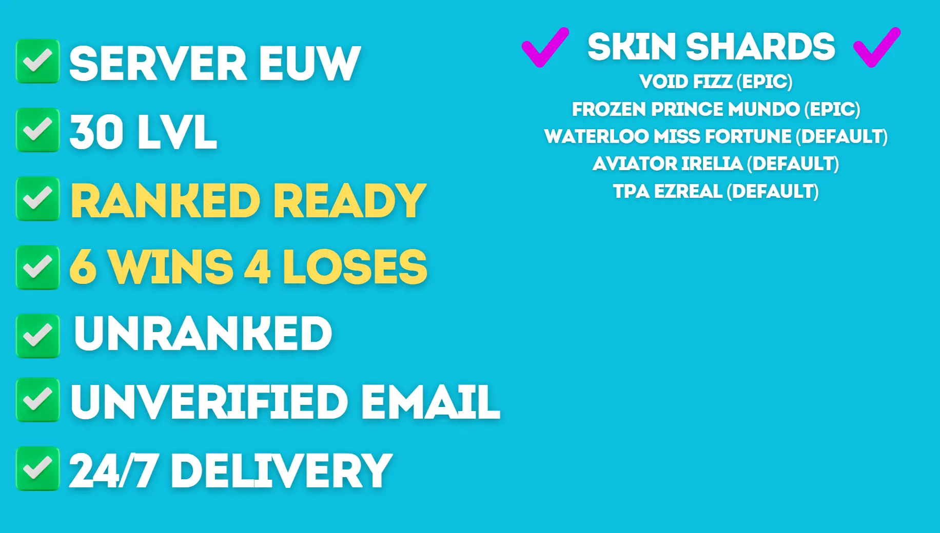 EUW 30 LvL ✅ Ranked Ready ✅ BE: 61000 ✅ Unverified ✅ Unranked ✅ Shards: Void Fizz, Frozen Prince Mundo, Waterloo Miss Fortune, Aviator Irelia, TPA Ezreal