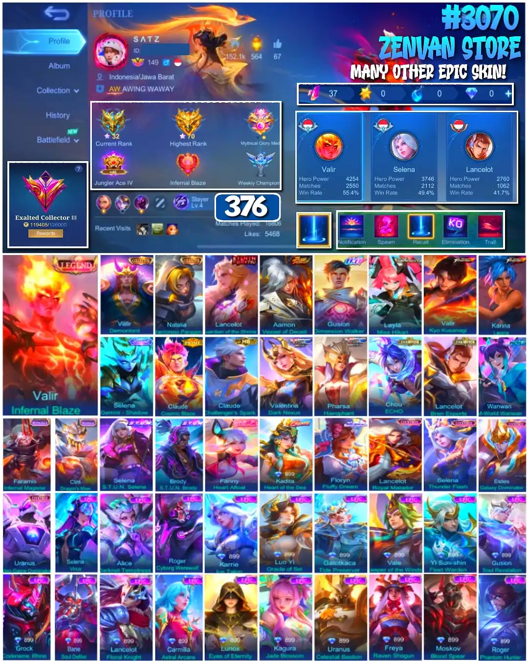 #3070 🔥 376 Skins 🔥 Legend Valir 🔥 Collector Valir, Natalia 🔥 11.11 Gusion 🔥 Soul Vessels Aamon 🔥 Mword Wanwan 🔥 KoF Valir, Karina 🔥 Many Limited 🔥 Many Epic 🔥 Safe Account ✅