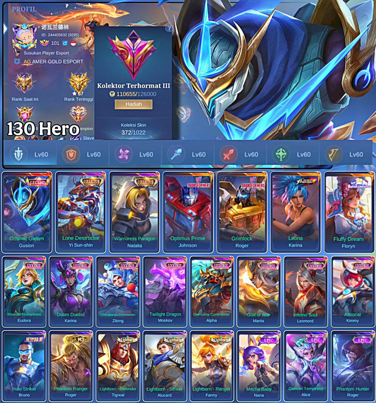 HERO 130 SKIN 372 | EMBLEM ALL MAX | LEGEND GUSION | COLECTOR YSS | COLECTOR NATALIA | TRANSFORMER ROGER | HERO GOOD | SKIN GOOD | INSTAN DELIVERY