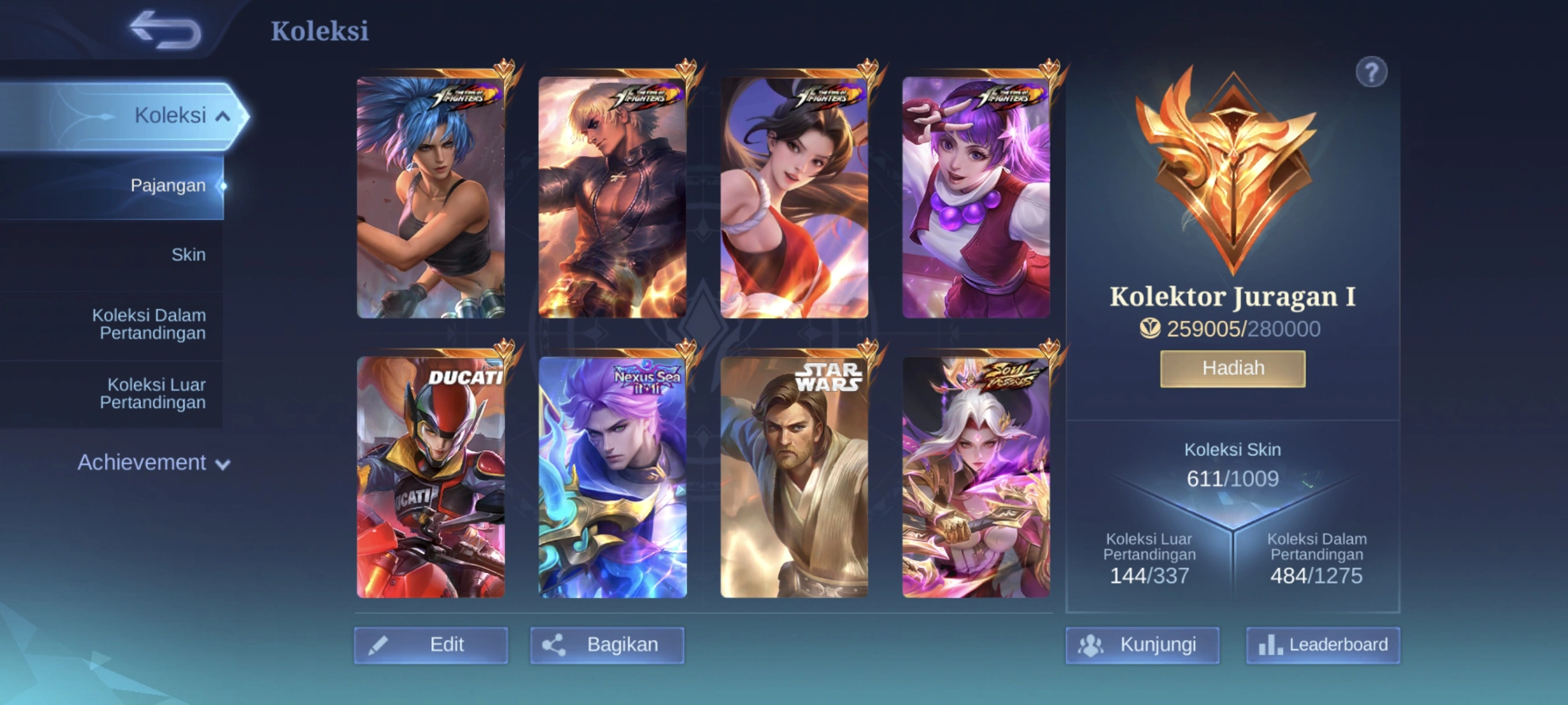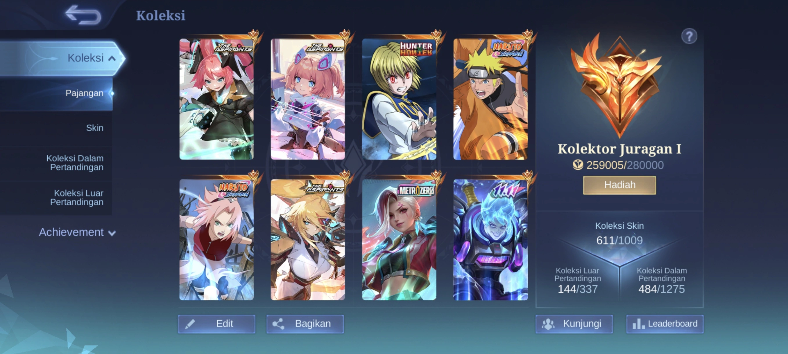 MM293|Lv103|611Skin|MEGA COLLECTOR I|3LEGEND|2STARWARS|4KOF|SOULVESSELS Hanabi|3ASPIRANTS|DUCATI Irithel|2NARUTO|HxH Kurapika|METROZERO Ixia|3COLLECTOR