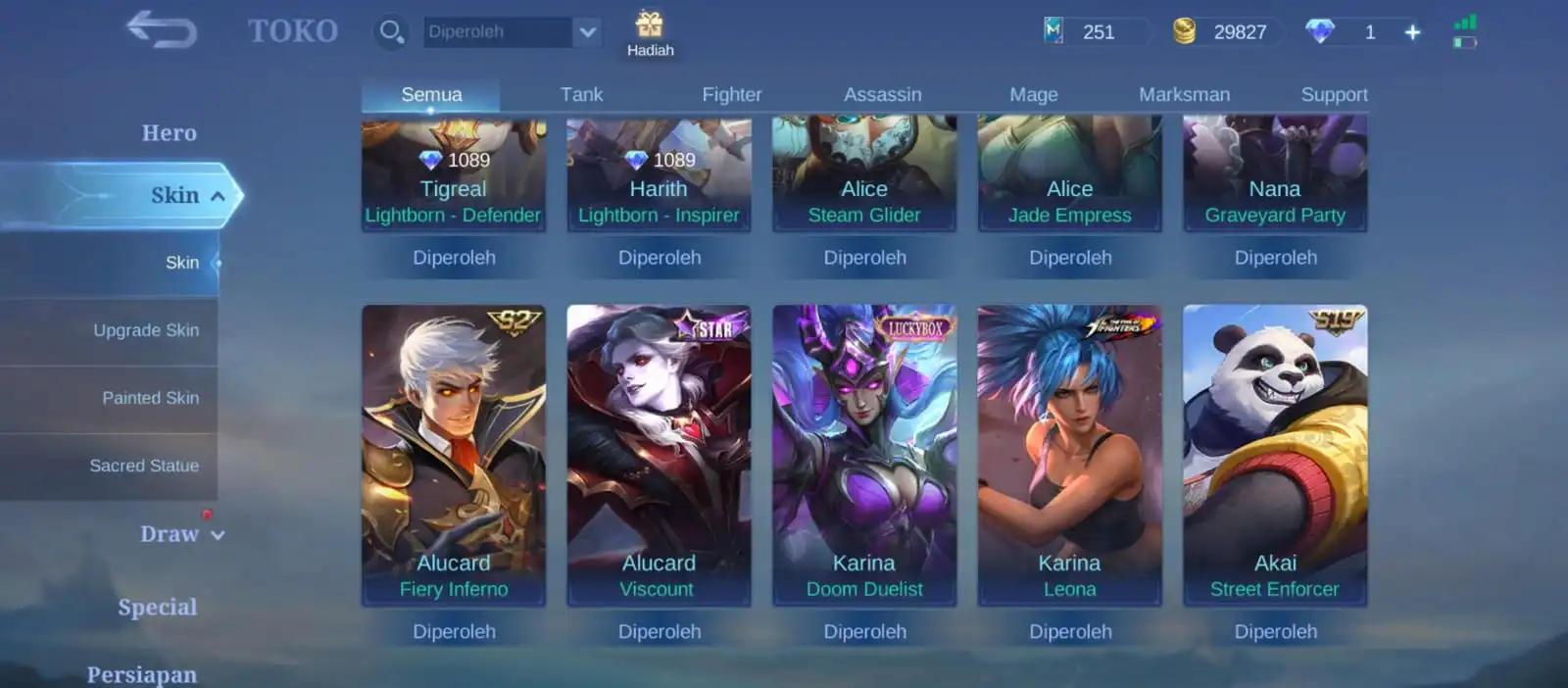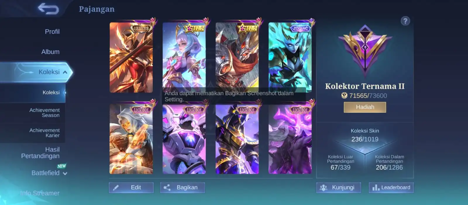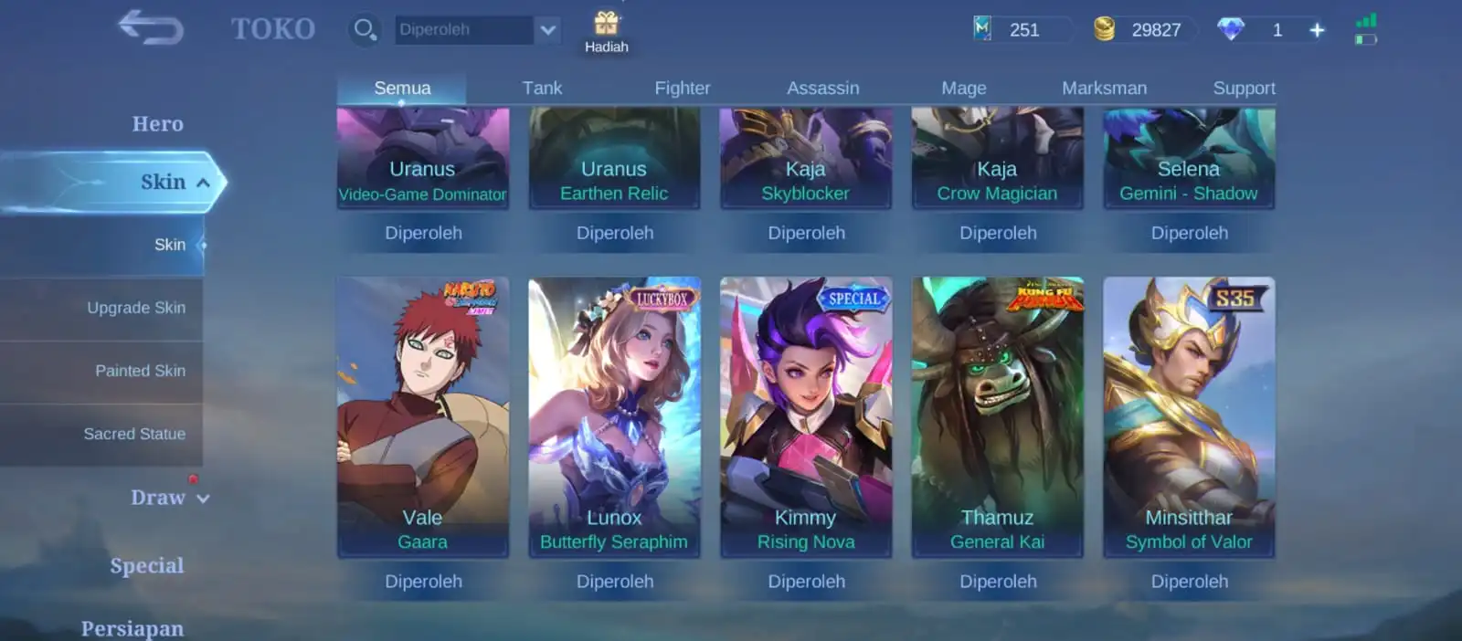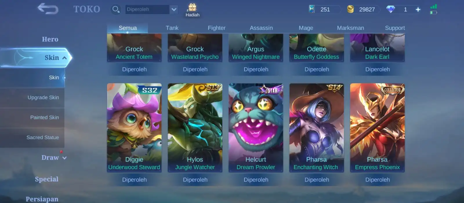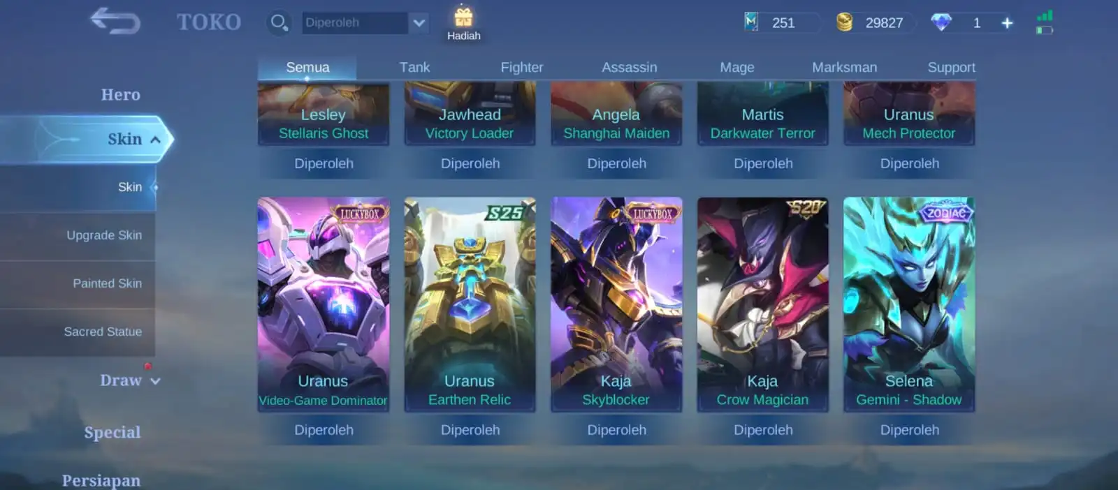 MW73/LV64/110HERO/236SKIN/EMBLEM MAX/COLLECTOR PHARSA/ANNUAL HAYABUSA ANGELA/ZODIAC SELENA/THAMUZ PANDA/YUZHONG M5/6 LUCKYBOX/12 EPIC/163 MW