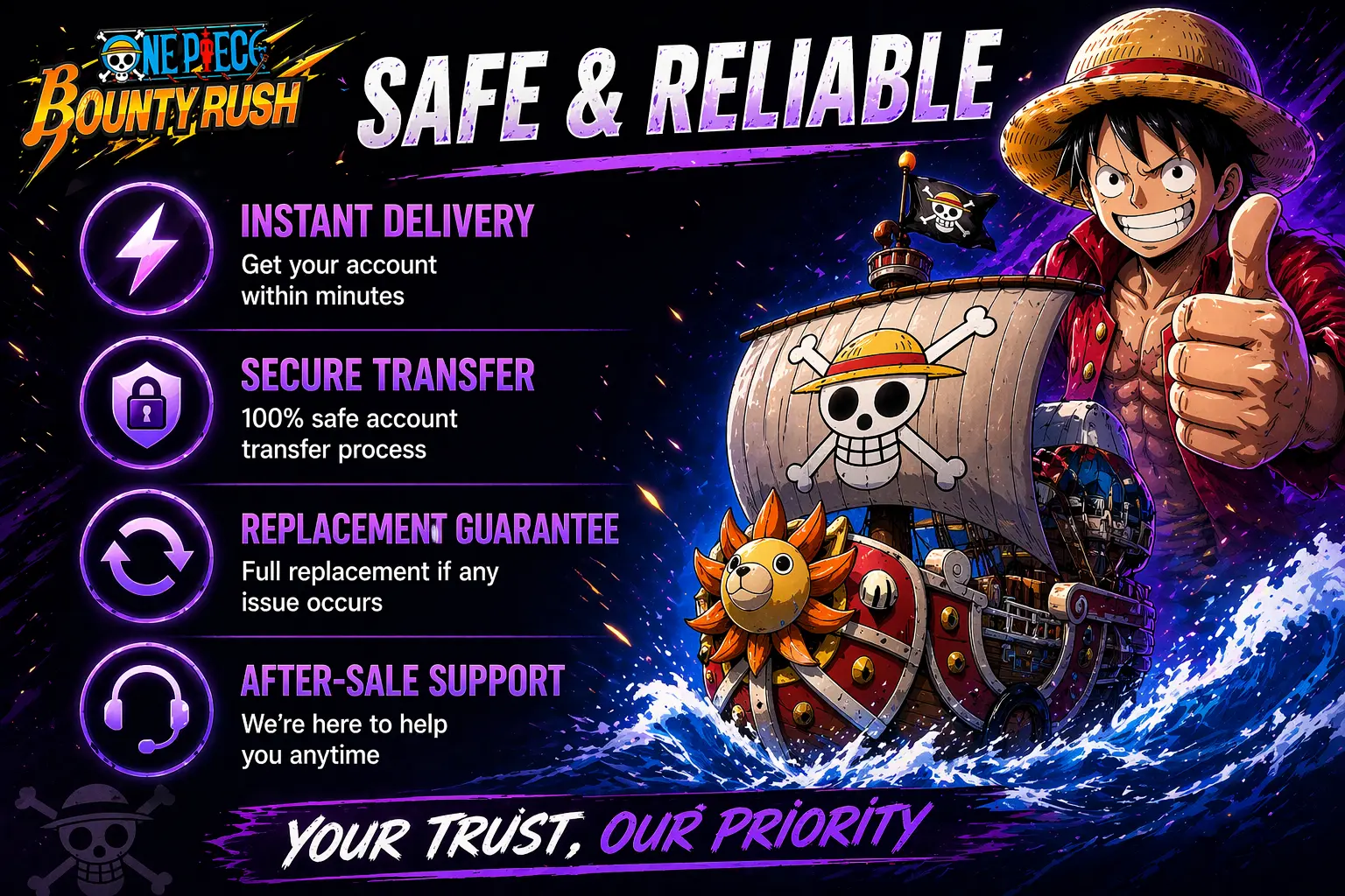 “GameBoost is not affiliated, endorsed, sponsored, or authorized by Bandai Namco Entertainment Inc., One Piece Bounty Rush, or any of its subsidiaries or affiliates. Bandai Namco Entertainment Inc.’s official website can be found at: https://www.bandainamcoent.com. The name One Piece Bounty Rush, as well as related names, marks, emblems, and images are registered trademarks of their respective owners. Use of trademarks is covered by fair use principles under EU Regulation 2017/1001, Article 14.”