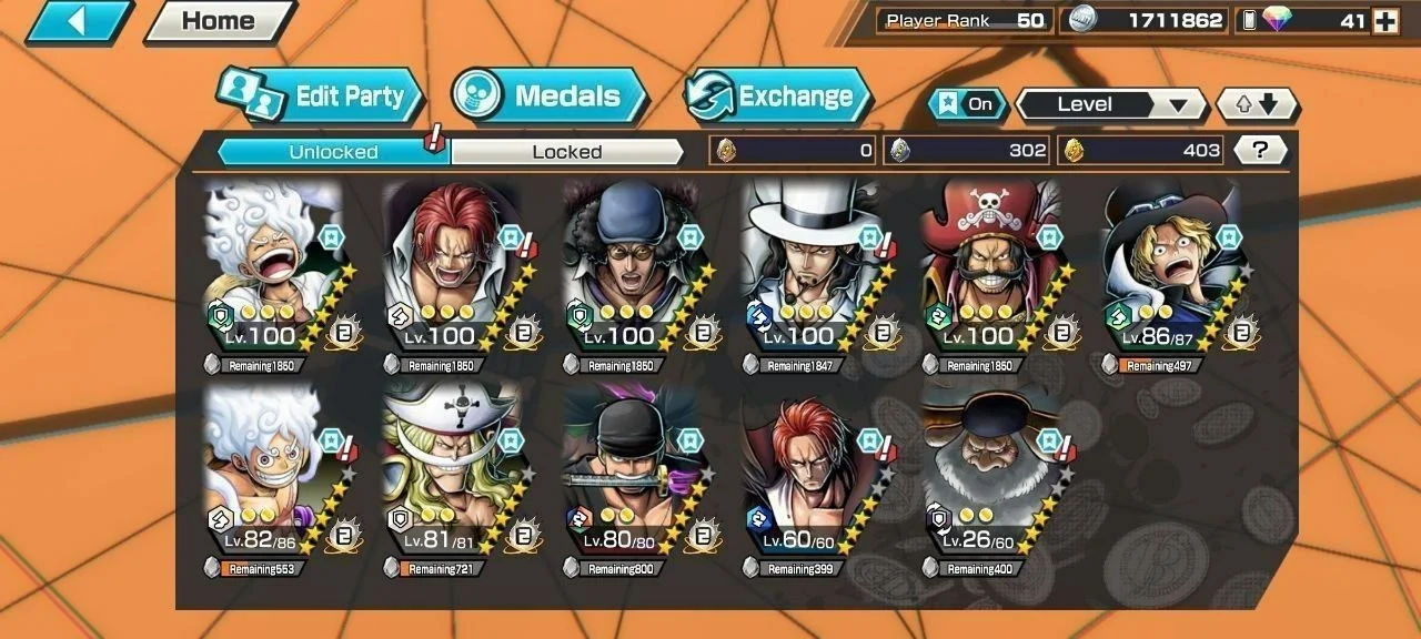 IOS Android 🛍️ Level 50 🏹 EX 11 🧨 Luffy 💯 Shenks 🎖️ Kozan 🏆 Lochy 🗡️ Rager ✅ Zoro ⸱ Setren ⚔️ Code1588