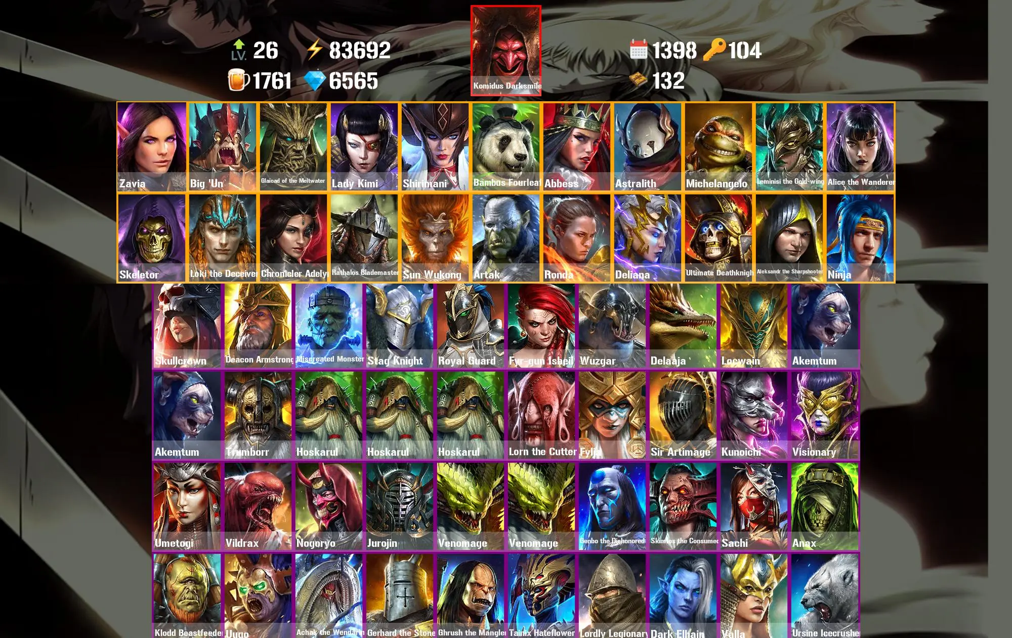 1398 Days 83.7k Energy [Mythical Starter] Komidus Darksmile ⸱ Zavia ⸱ Big 'Un ⸱ Glaicad of the Meltwater ⸱ Lady Kimi ⸱ Shirimani ⸱ Skullcrown ⸱ Deacon Armstrong ⸱ 50.7m Silver ⸱ 6.6k Gems
