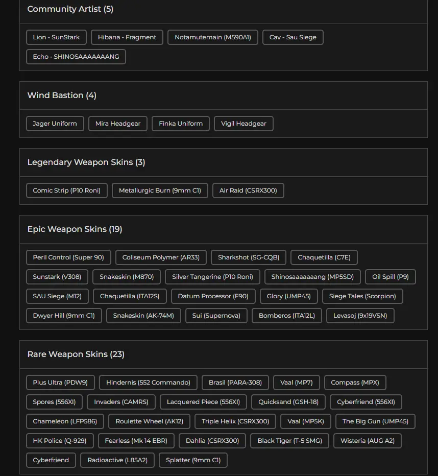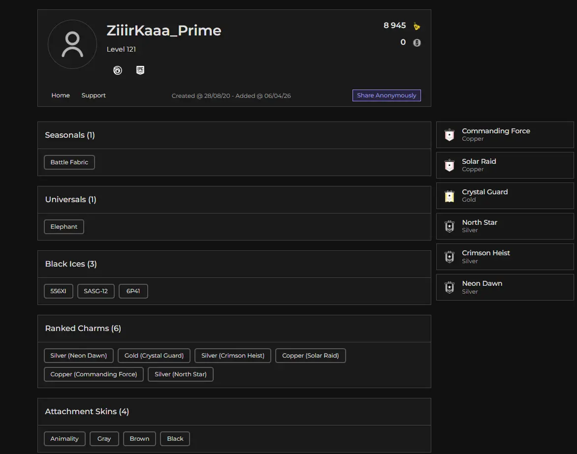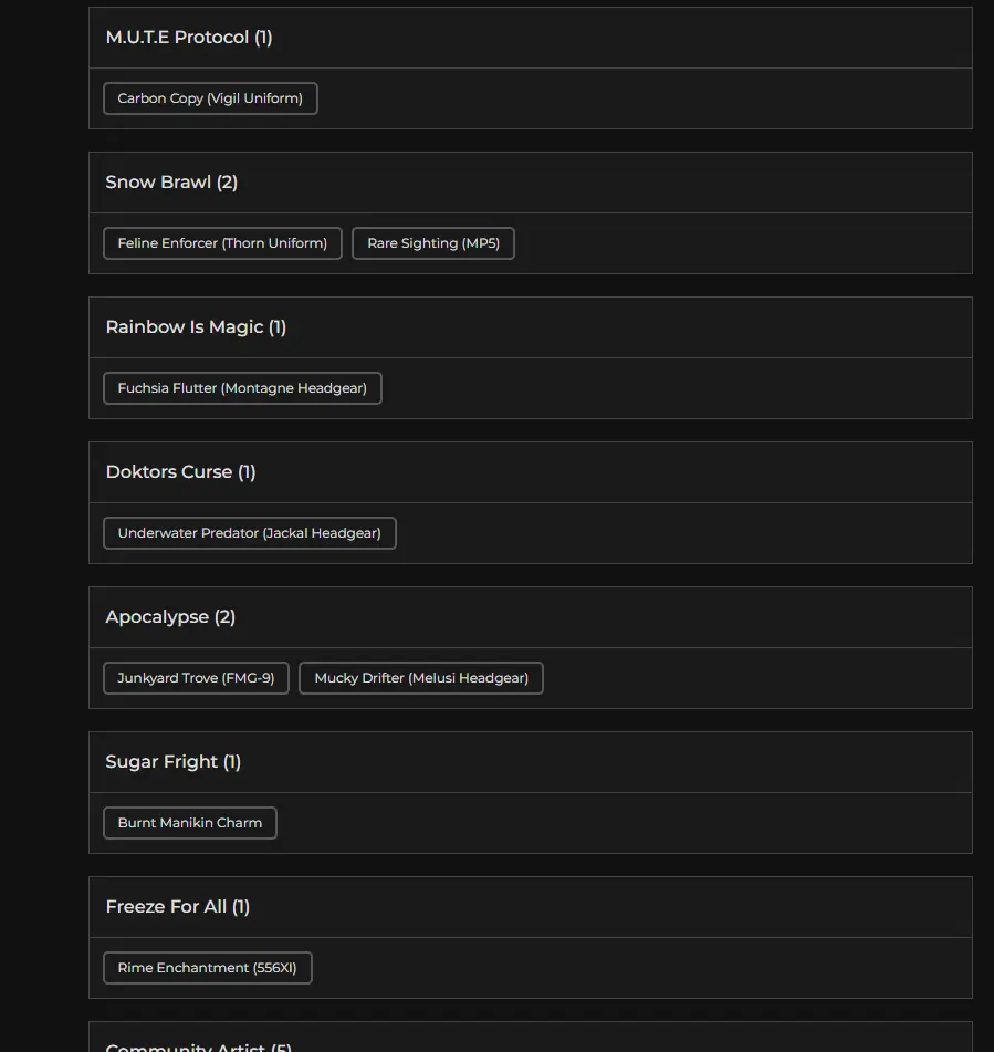 💙 68 skins + 58 operators 🔷 Black Ices 3 🔷 Universals 1 🔷 Seasonals 1 🔷 Ranked Charms 6 🔷